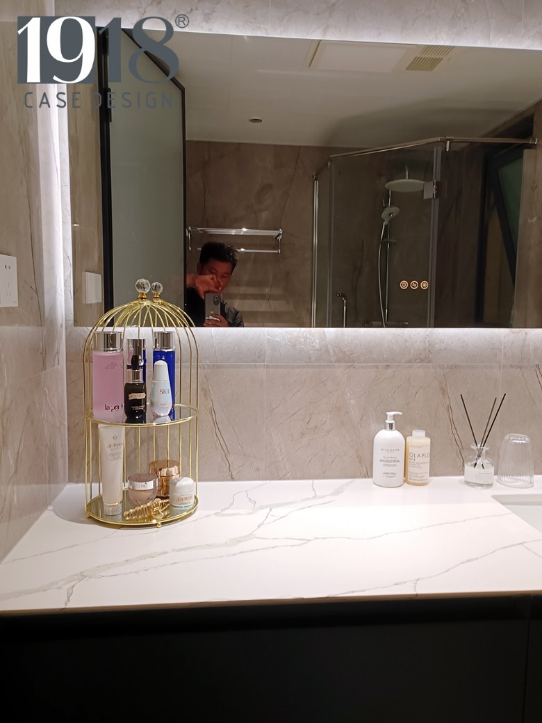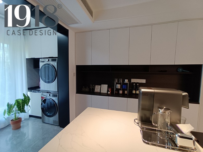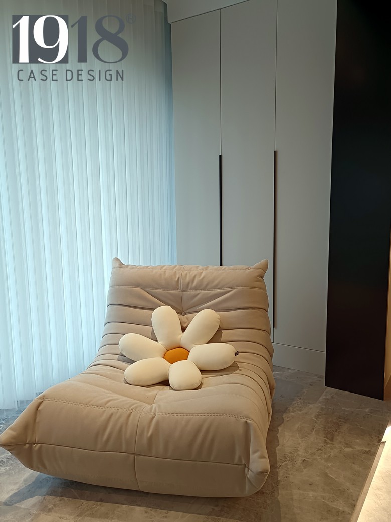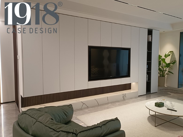 先来说说客厅空间,沙发背景以整面木饰面为背景,白色大理石点缀色,营造现代风格感受。踢脚线选用隐藏式黑色及窄样式,有一种平和感,又有着镇静充满性感的气息。
