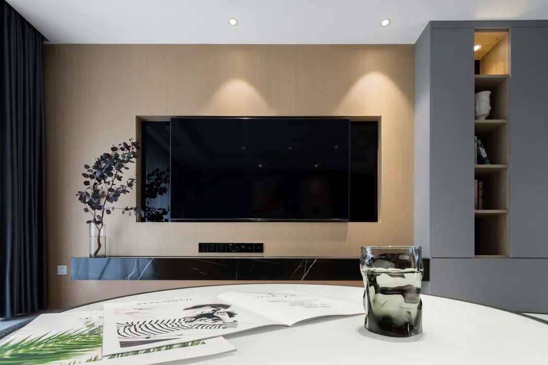 ▲电视墙以木饰面的定制,中间留空电视机的壁挂安装位置,装上黑色悬空的电视柜,右侧是灰色的收纳柜+书架展示架,整个电视墙给人一种现代简约而实用的高级效果。