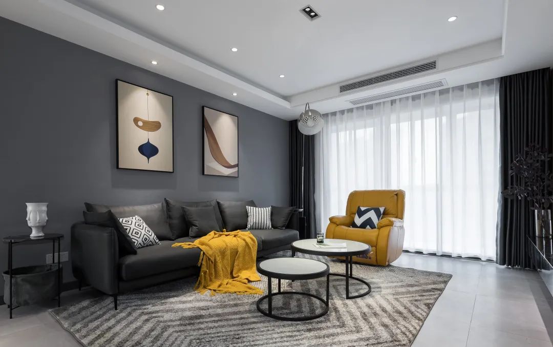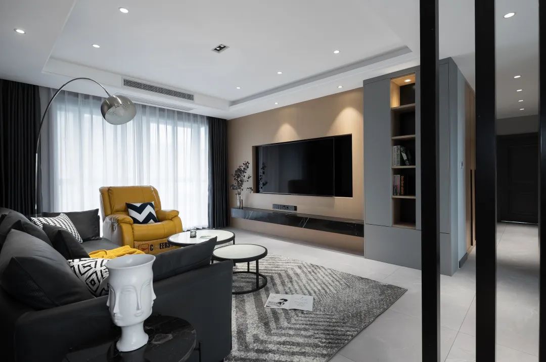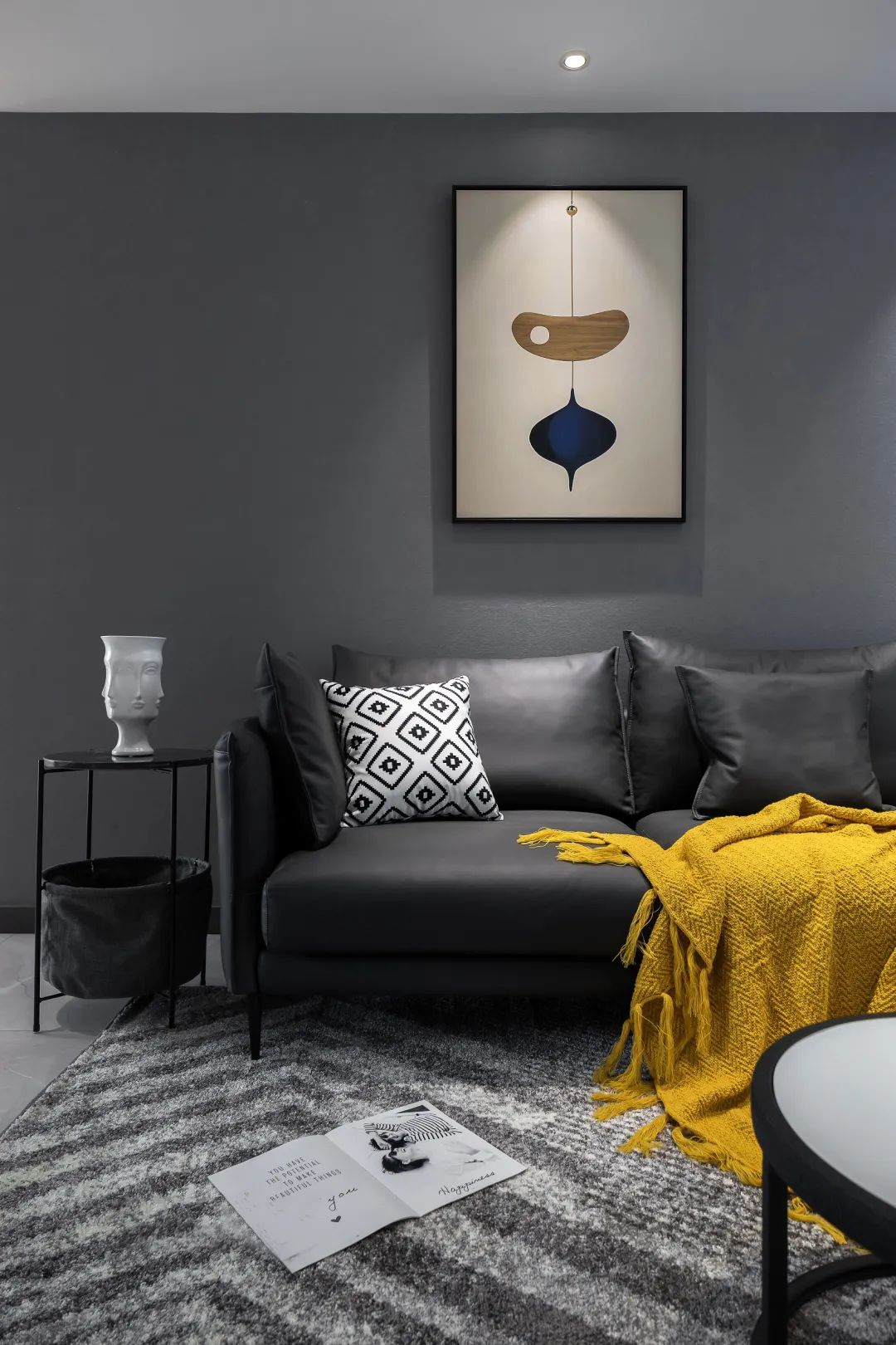 ▲客厅空间,天花采取无主灯的吊平顶设计,灰色沙发墙,并融入了布艺沙发、地毯等软装,使得整体看上去更加有层次,电视墙这是木质面定制的设计,加入黄色皮沙发椅与毯子,带来一种简约而又有活力的空间气息。