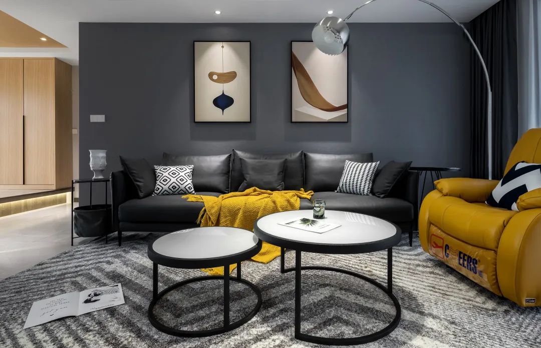 ▲深灰色沙发墙,挂上两幅抽象装饰画,摆上深灰色布艺沙发、两张圆形的石材茶几组合,边上一盏落地灯,使得空间充满低调高级的氛围感。