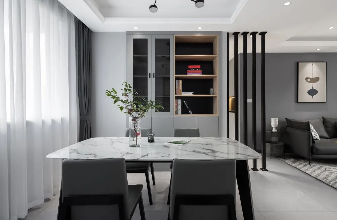 ▲餐厅左侧是厨房门,右侧定制一个入墙式的餐边柜,中间摆上黑白配的餐桌+灰色皮艺餐椅,简洁时尚与现代的氛围格调充满了整个餐厅空间。