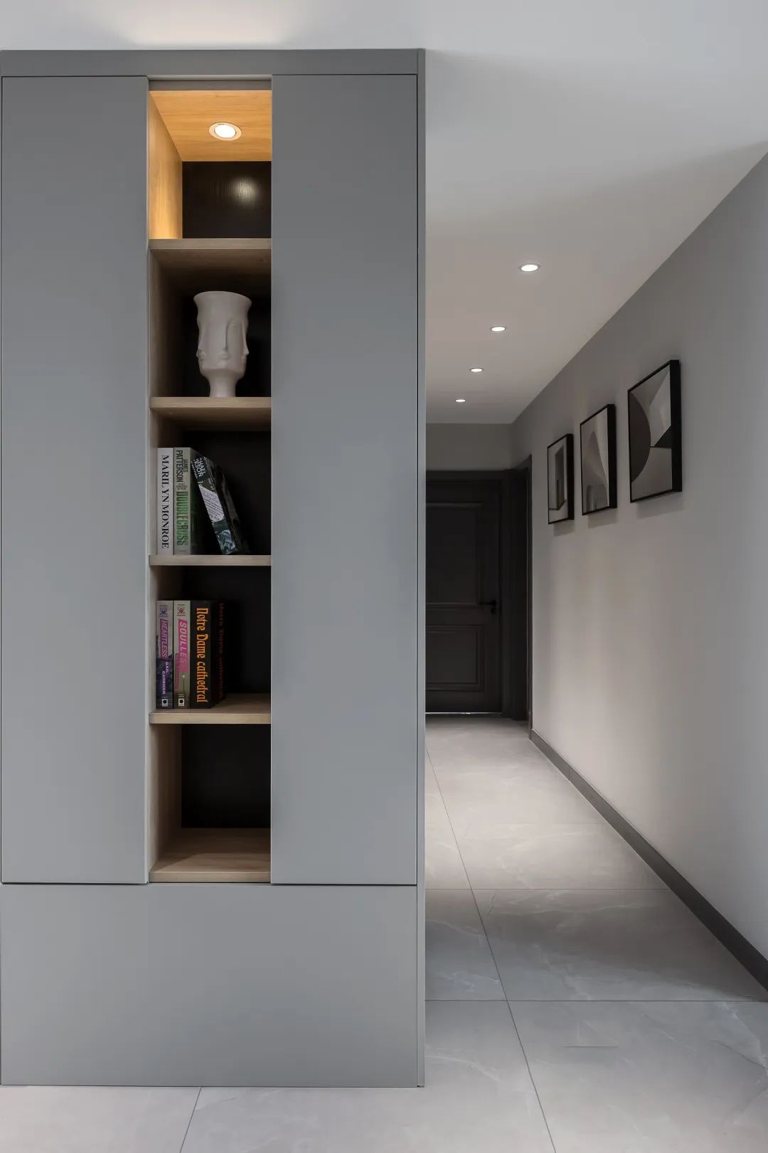 ▲电视墙的灰色定制柜右侧是过道空间,灰色地砖与墙面空间,右侧墙面挂了三幅小尺寸的装饰,使得过道空间也简洁舒适。