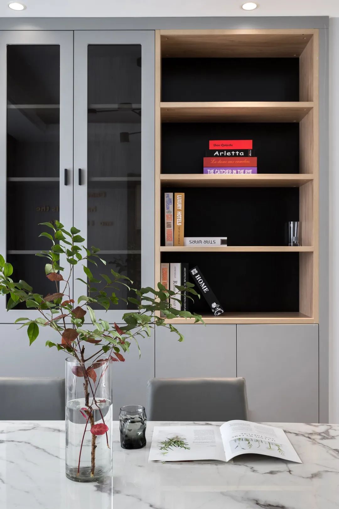 ▲餐桌上摆着玻璃花瓶,后方餐边柜上摆着书籍,整个用餐空间给人一种清新舒适的文艺与精致感。