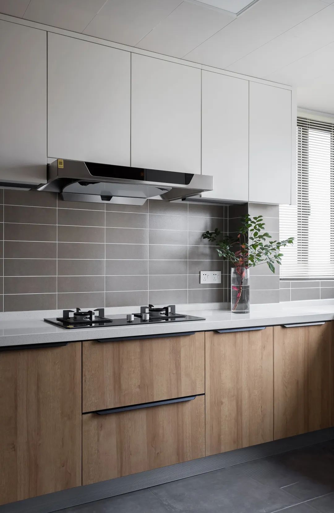 ▲厨房以灰色的地面与墙面砖,装上原木色的橱柜+白色的操作台面,窗户装着百叶帘,为主人营造了一个简约舒适而明亮清新的烹饪空间。