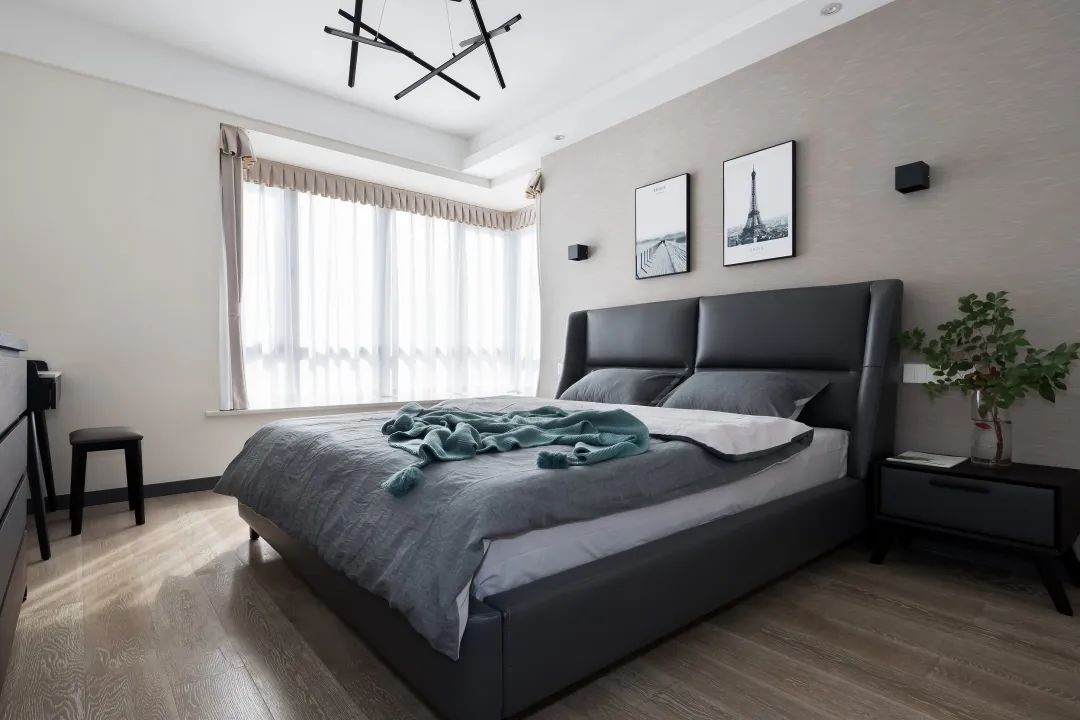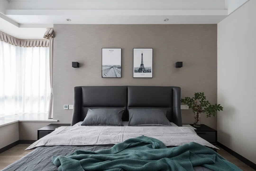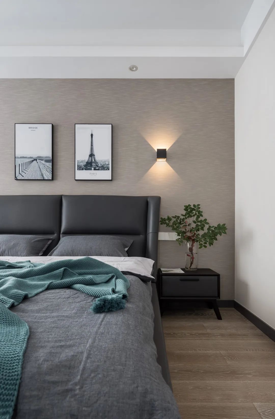 ▲咖灰色调的床头墙上,挂上两幅黑白调的装饰画,左右侧黑色床头柜上装着黑色小壁灯,整个空间简洁而不失现代设计感。