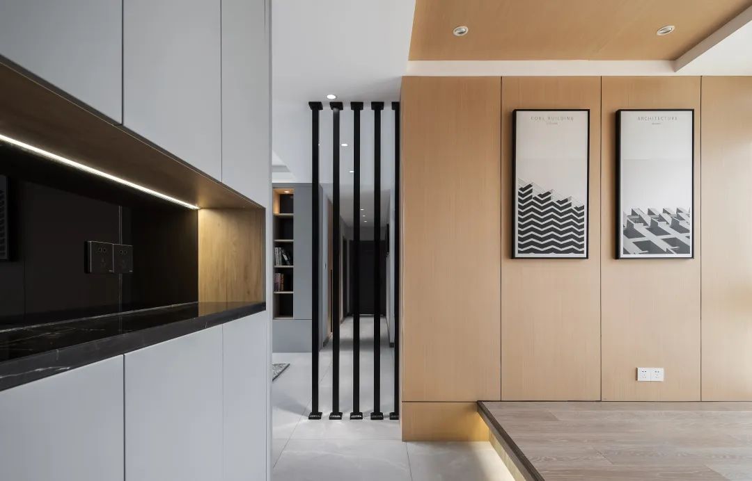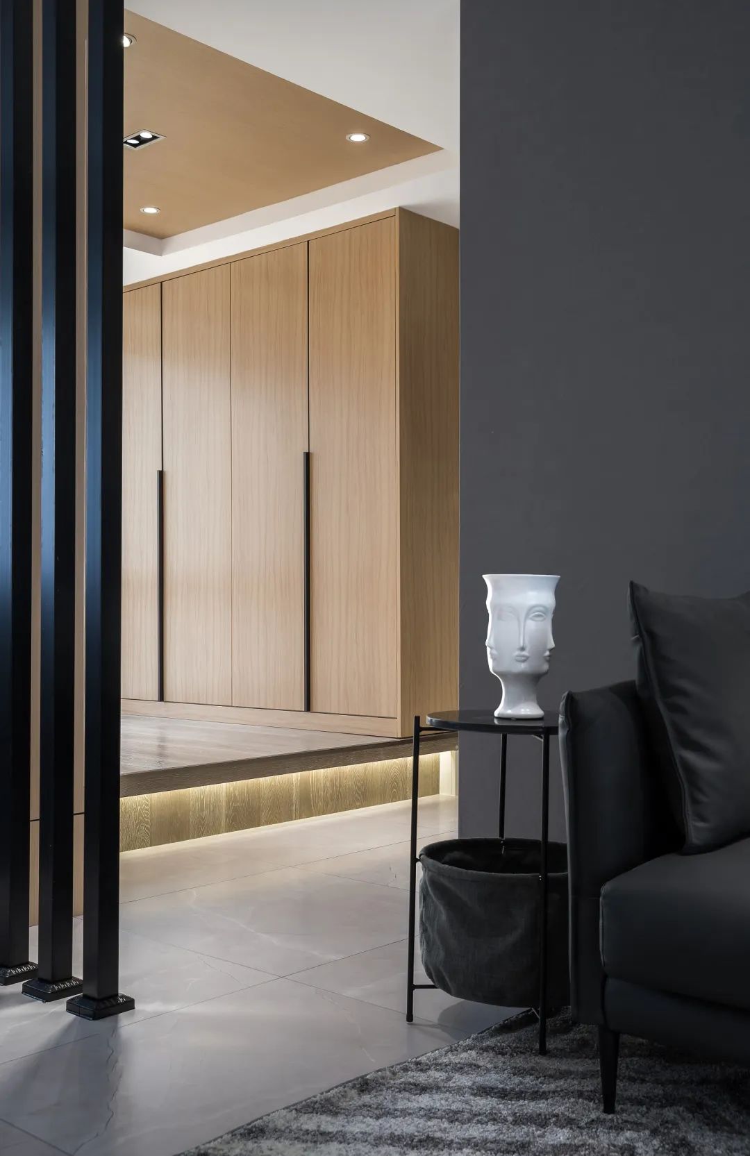▲玄关左侧是定制鞋柜,右侧是抬高的地台,针对大门的过道装了一道黑色格栅屏风,使得空间感舒适优雅而又私密。
