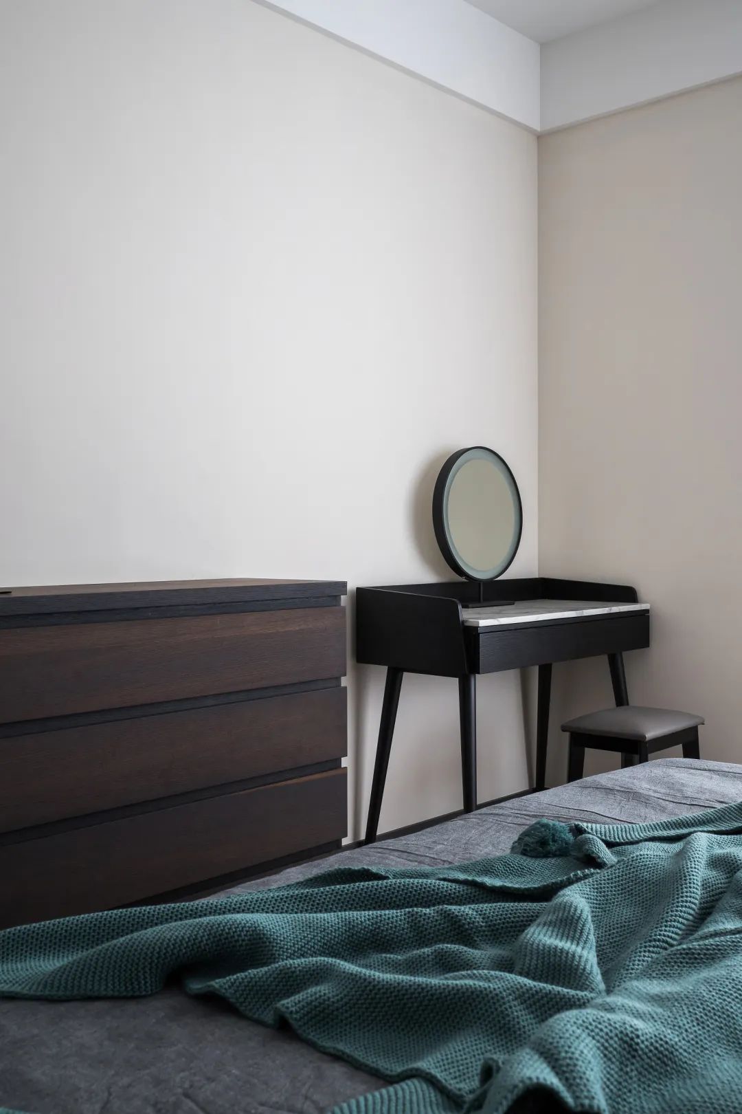 ▲床尾布置一个斗柜,角落处还有一张小梳妆台,为主人提供了一个端庄舒适的休息、梳妆的卧室空间。