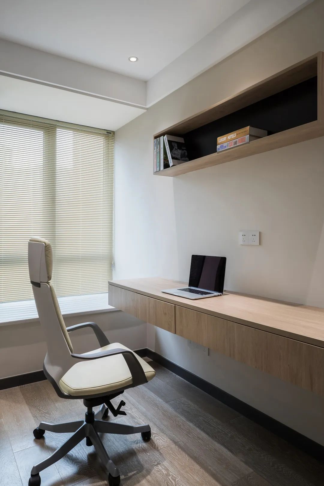 ▲书房装上悬空书桌与书架,摆上一张休闲办公椅,还有飘窗与百叶帘的设计,为主人打造了一个实用舒适的书房区域。