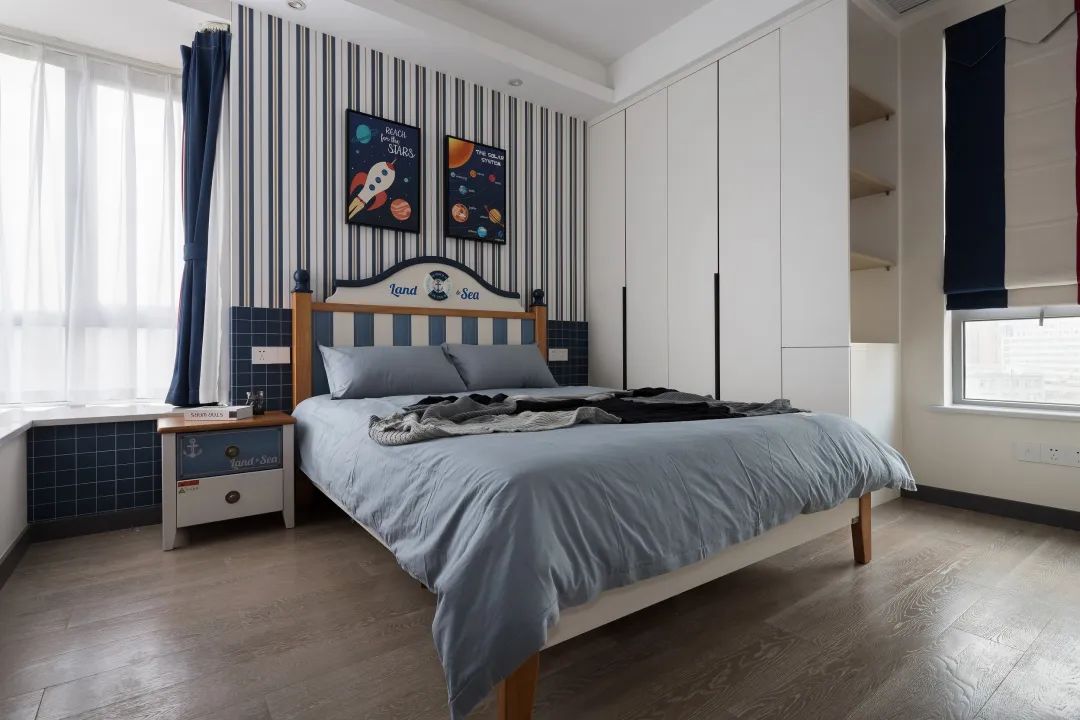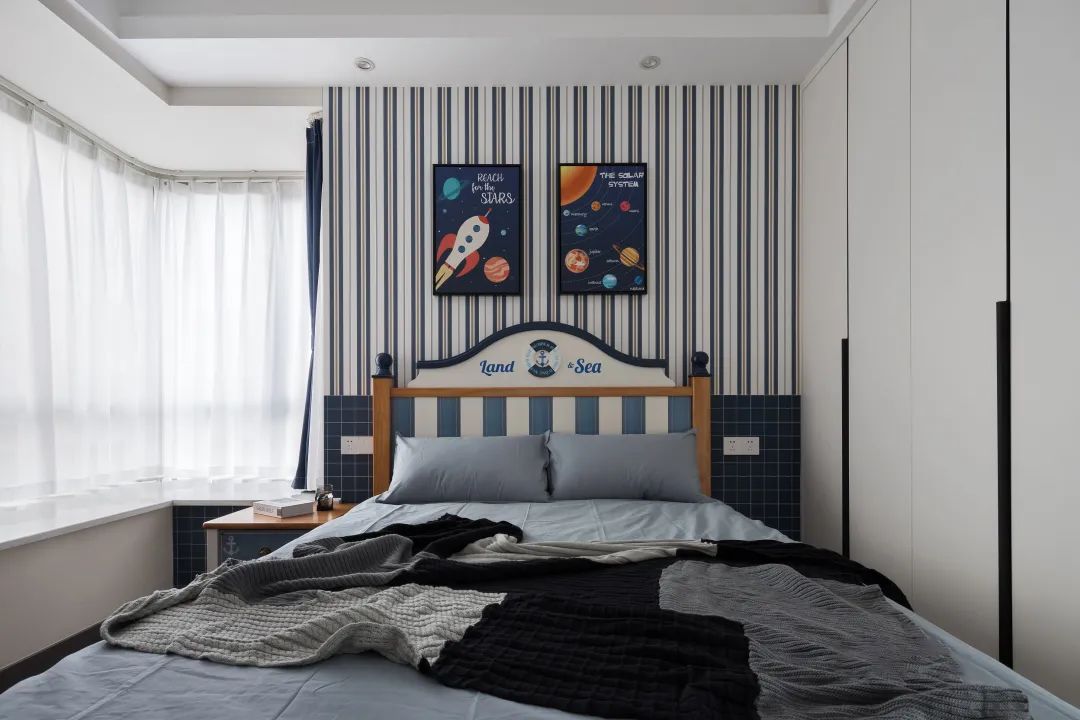 ▲儿童房的床头墙贴着蓝白竖纹的墙布,挂上两幅太空主题的装饰画,摆上一张儿童床+灰色床单,使得儿童房空间也是显得童趣舒适而清新惬意。