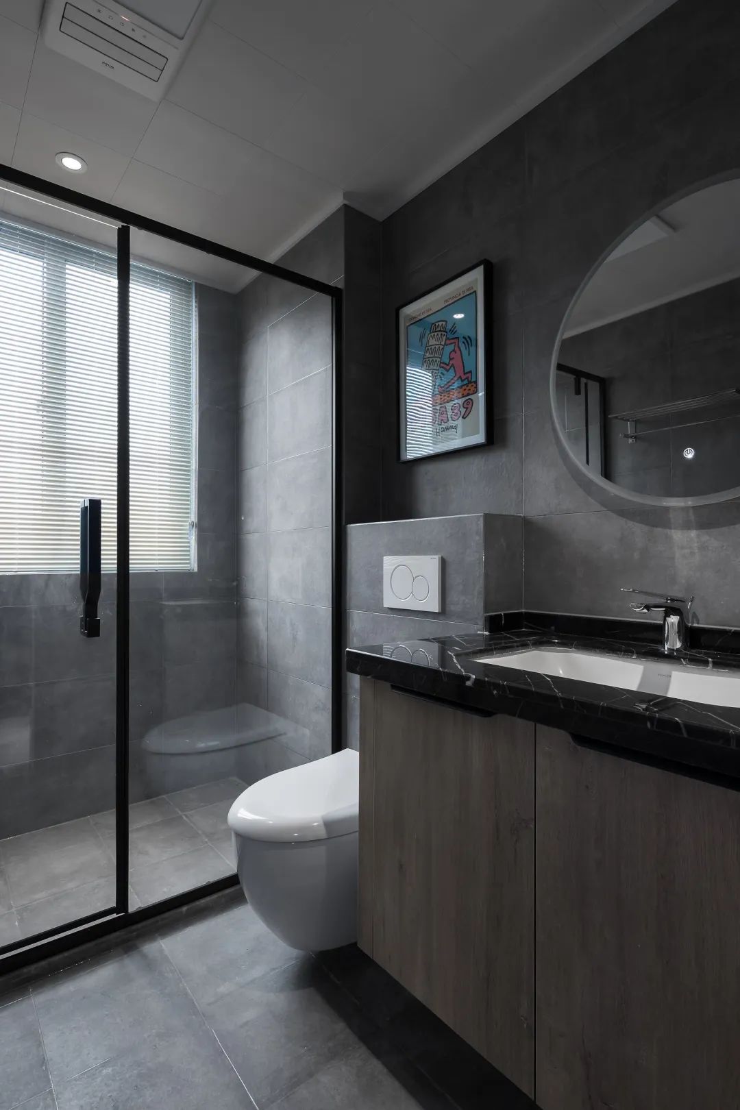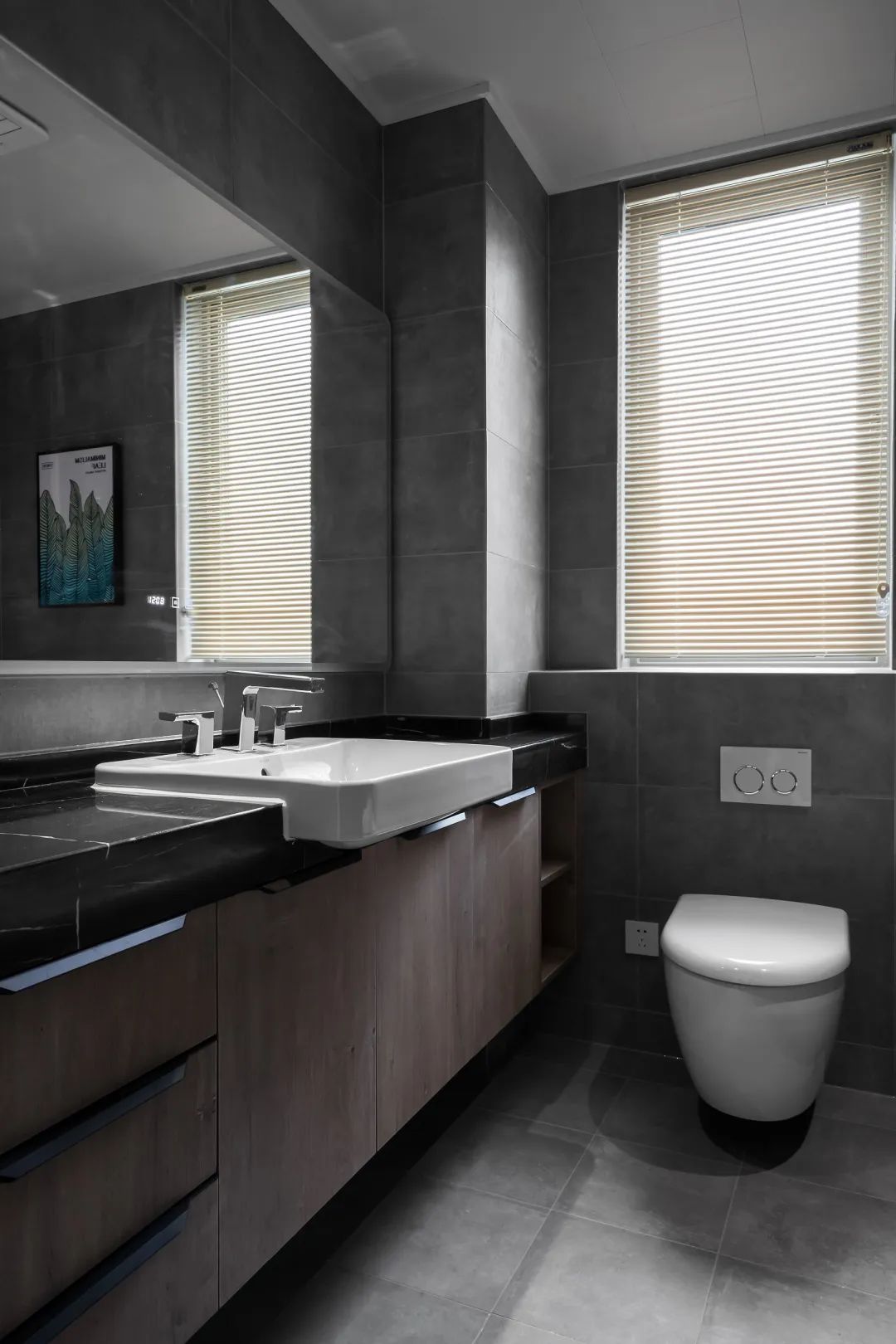 ▲另一个卫生间也是采取同样的灰色瓷砖+灰木色浴室柜设计,不同的布局也搭配出了类似的空间氛围。