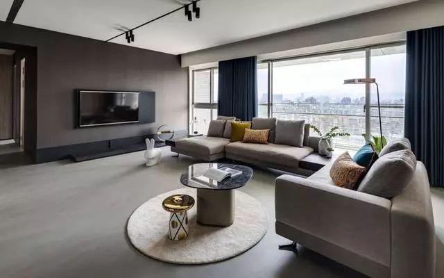 以护墙板作为设计的背景墙选择了深色的板材,与客厅主基调层次分明,同时抑制了落地窗带来的强烈光线,让空间光线看起来更为柔和。