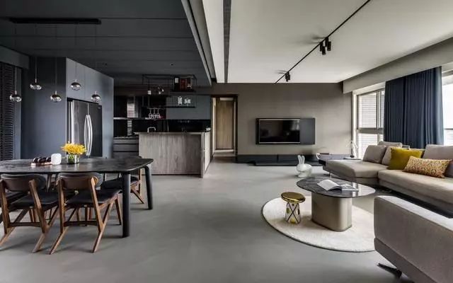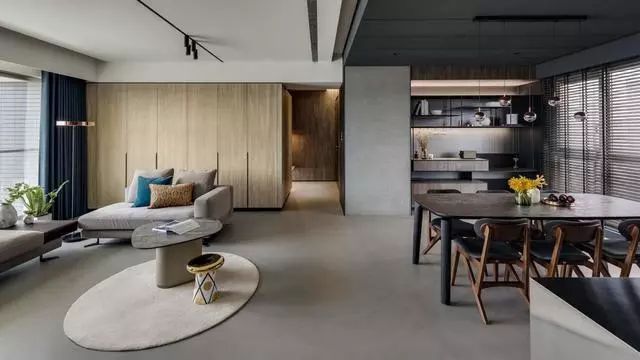 由玄关而入,一眼便可以看到没有做隔断的开放式客餐厅,地面是自流平水泥漆,以局部吊顶的方式来划分空间动线,这种自然的区隔方式更好地将客餐厅的功能区间划分开来。
