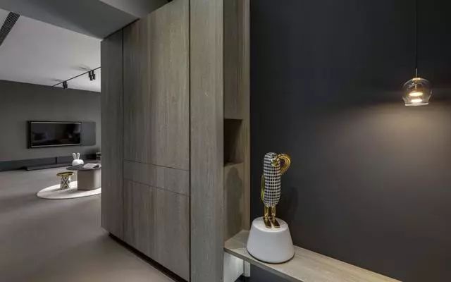 入门处定制了一个到顶大鞋柜,采用无明把手的设计,浅淡的原木色搭配灰色墙面,缓解了压抑感,柜面细腻的自然纹理隐隐透露着一抹高雅格调,在角落搭配一盏吊灯,更容易让人一进门就可以感受到家的温暖。