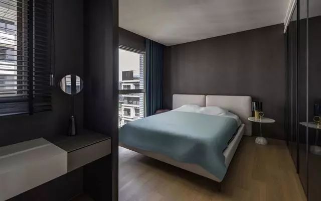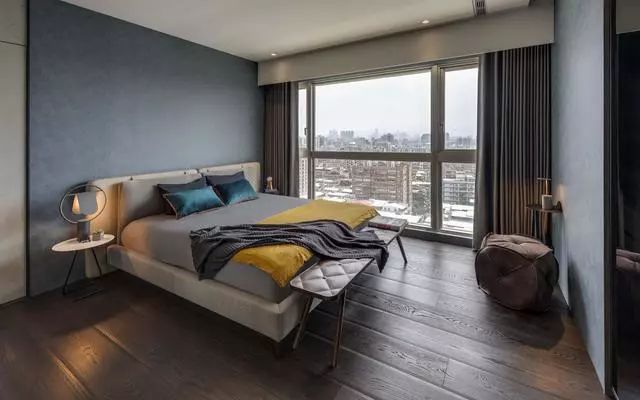 主卧铺了温润的木色地板,以小桌子的方式来取代床头柜,并搭配上一盏床头小台灯,透着温暖的光。低调的高雅蓝透着屋主不凡的品味,床铺配色冷暖交加,更是为这个休憩的空间增添了一抹年轻态的活力。