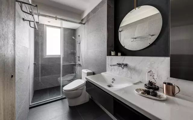 卫生间整体以灰色为主,以玻璃淋浴房作为隔断,做了干湿分离,并通过合理的规划,将整个卫生间分成:洗漱台-便器-淋浴房三个功能区域。