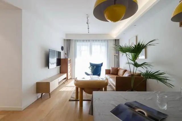 简洁的电视墙,摆上高低组合的电视柜,加入壁挂电视机,让客厅显得简洁大气;沙发墙上挂两幅装饰画,搭配焦糖色皮沙发、旁边加入大盆绿植的点缀,也让空间显得文艺清新而有趣。