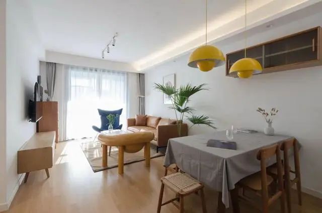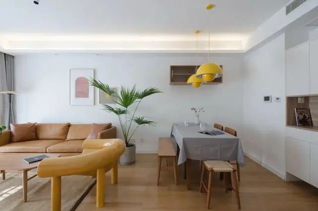 客厅的实木茶几+黄色休闲椅组合,也为空间增添了舒适自然的气息;餐厅区域与客厅挨在一起,实木餐桌椅组合加入了一张板凳,餐桌垫上灰色桌布、上方吊着两盏黄色吊灯,使得空间充满文艺活泼的气息感。
