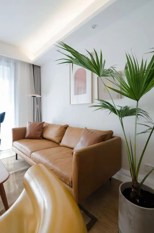 焦糖色的皮沙发,搭配上简约范的挂画、水泥盆的盆植,整个空间充满文艺精致的清新气息。