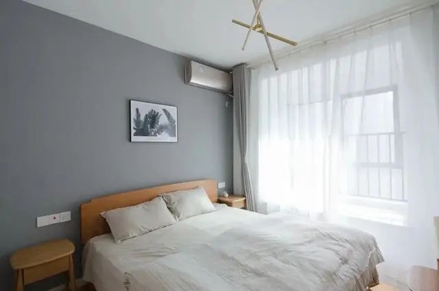 卧室以灰色乳胶漆的床头墙设计,布置上一张实木床+两侧实木床头柜,铺上洁白的床单,搭配上灰色窗帘与透光纱帘,使得整个空间都充满。