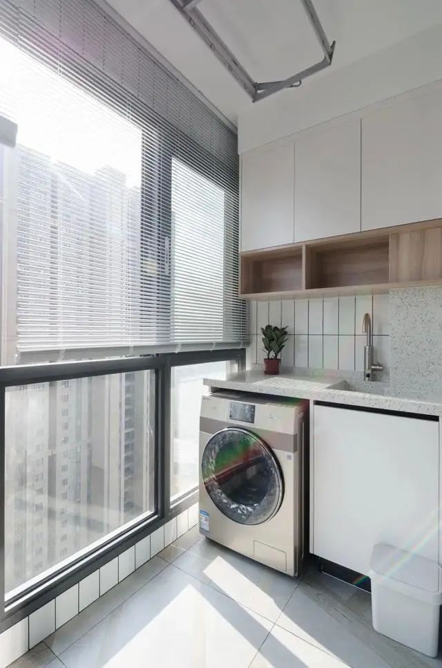 阳台侧边布置洗衣机+洗手盆柜组合,上方装了吊柜可以收纳杂物与洗衣用品,同时封窗装上百叶帘,让阳台空间显得私密而又明亮大气。