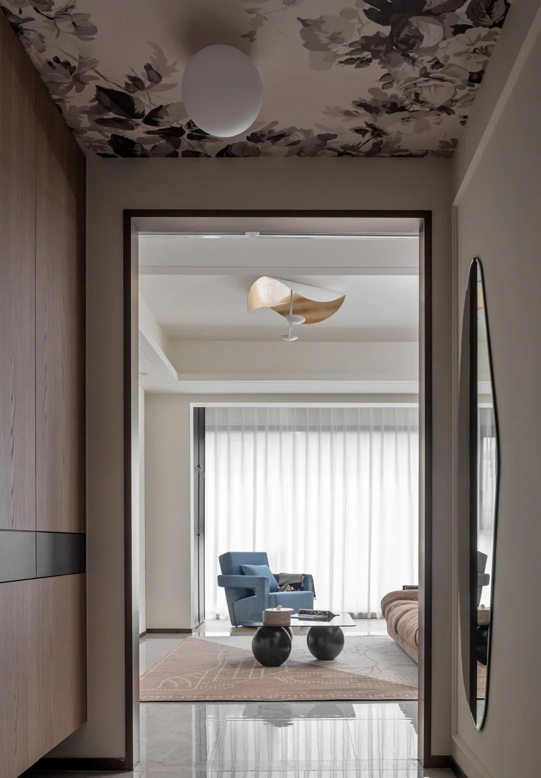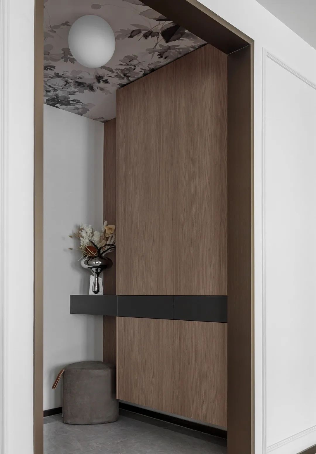 完美利用玄关处冗余的空间,重塑空间秩序。于顶部铺展的花卉墙纸与温柔的木色糅合,在光影流转中调和出蕴含平静细腻情绪的一方入户空间,视觉上增强进门仪式感。
