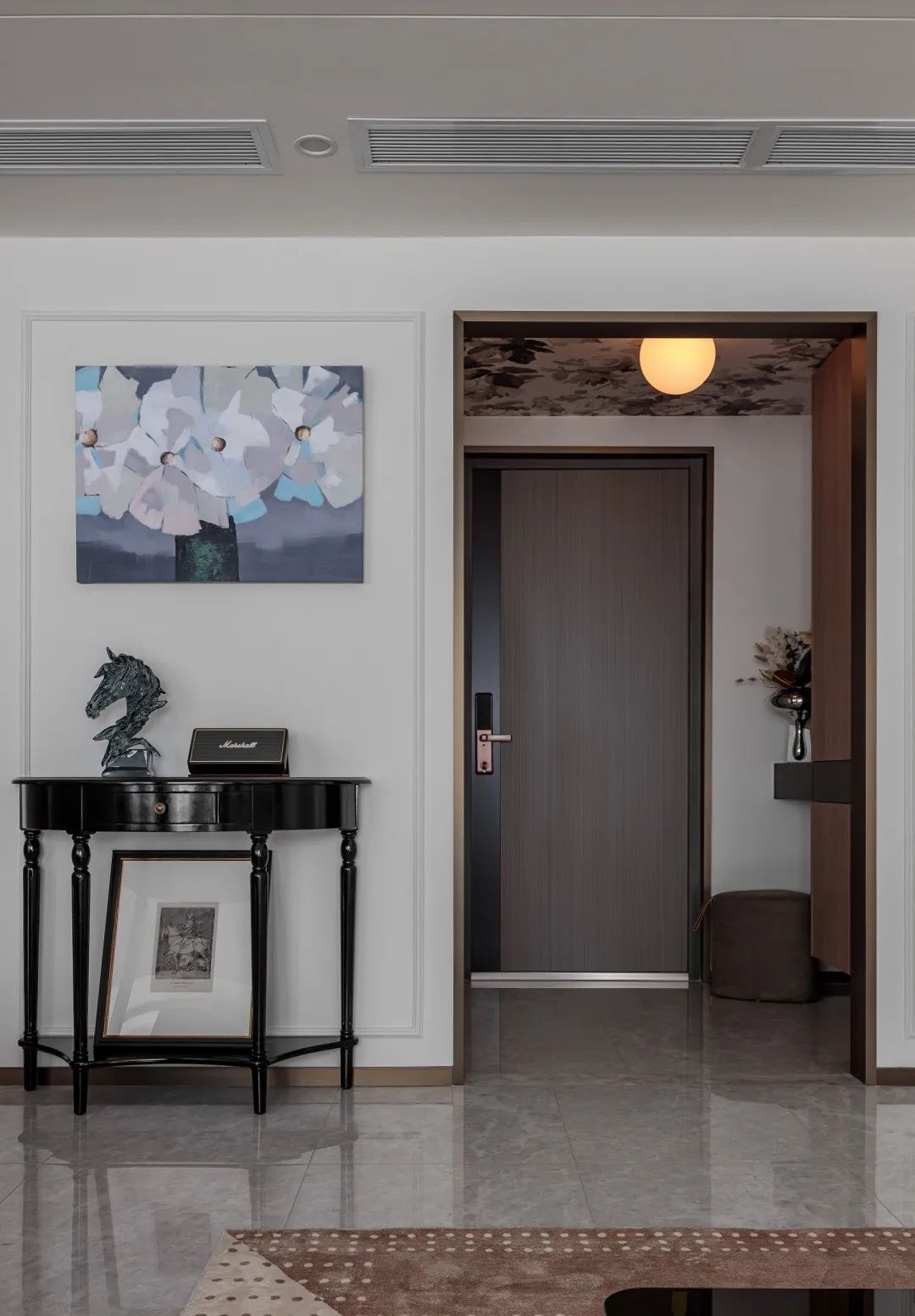 简洁的石膏线条制造框景,玄关柜与手工油画再现富有情调的生活模式,消减空间枯燥感。