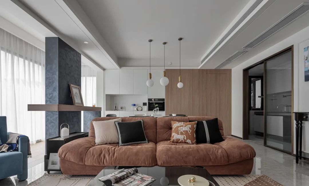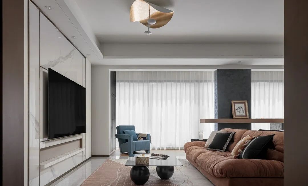 咖色沙发与卡其色的地毯勾勒出视觉重点,围合的形态实现空间于有形与无形之间的无缝转换。
