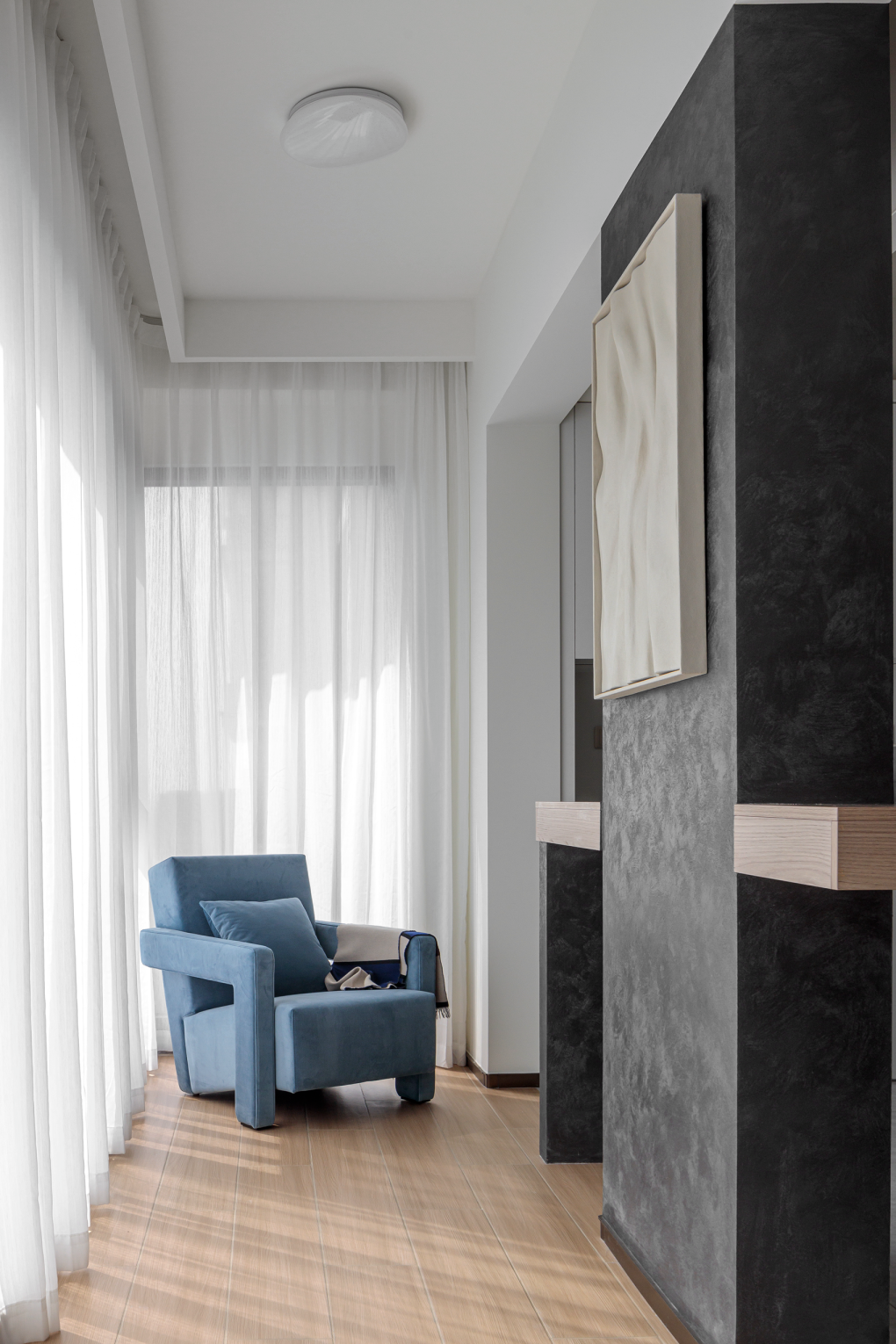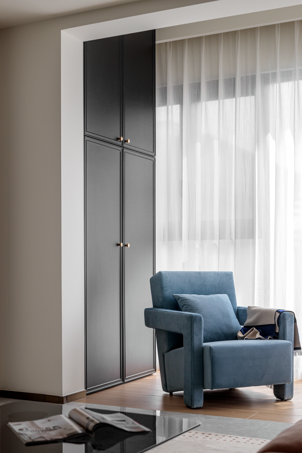 利落的造型包含理性的感知。一抹星蓝是暖调空间中独特的存在,明亮轻快的点缀是理性与感性间恰到好处的平衡。