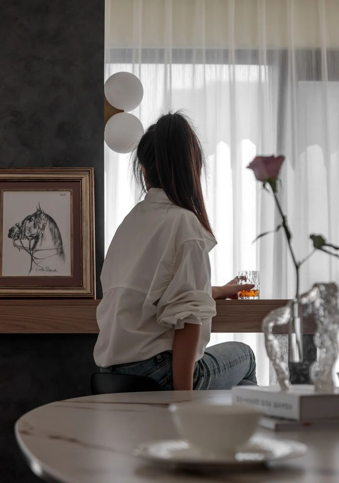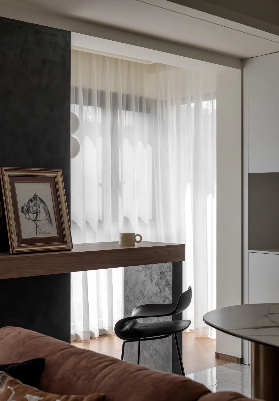 阳台处适当取舍,拆除推拉门,保留墙体并由此延伸一处吧台。一点巧思变废为宝,反而成全了舒适雅致的生活情调。