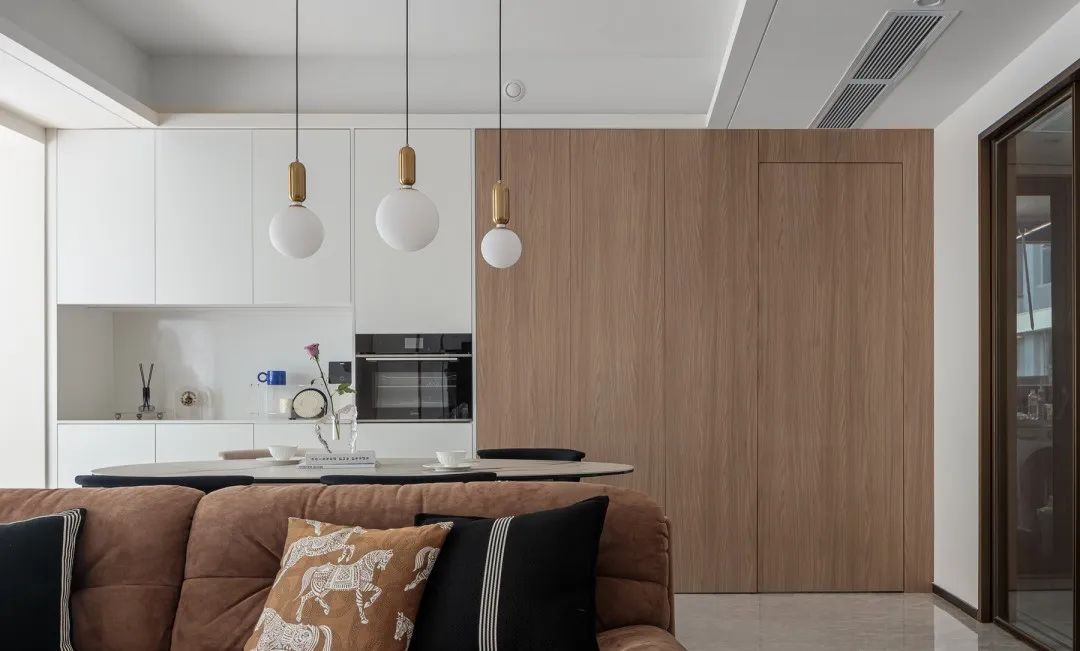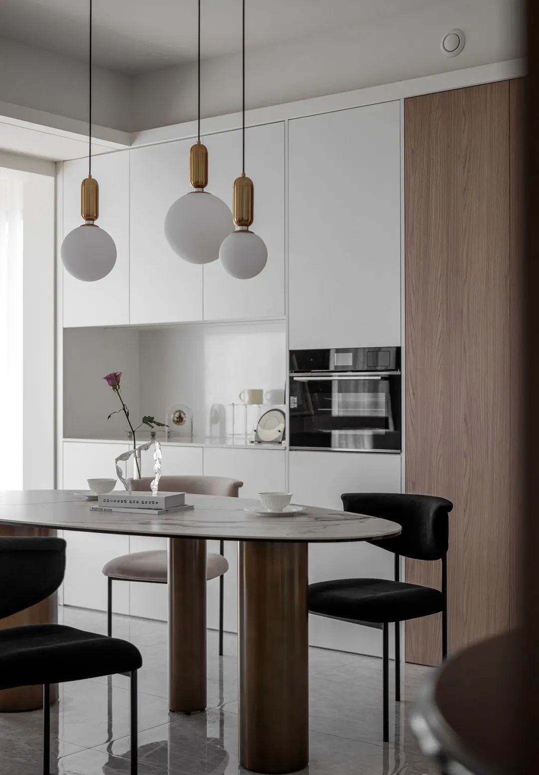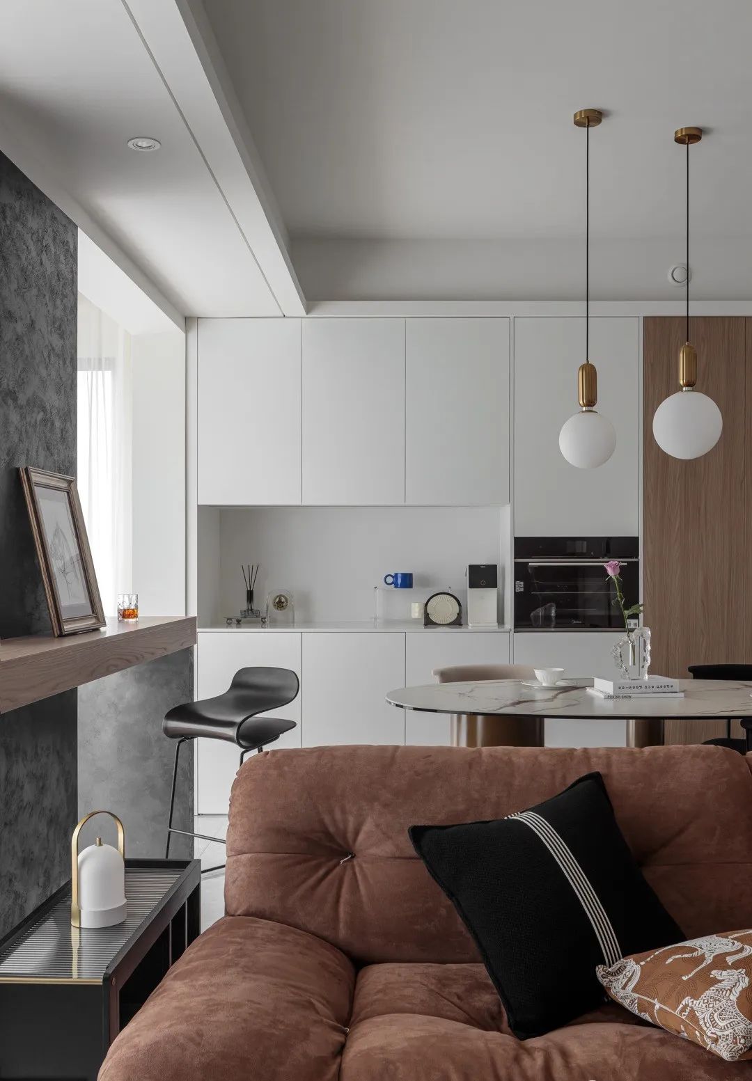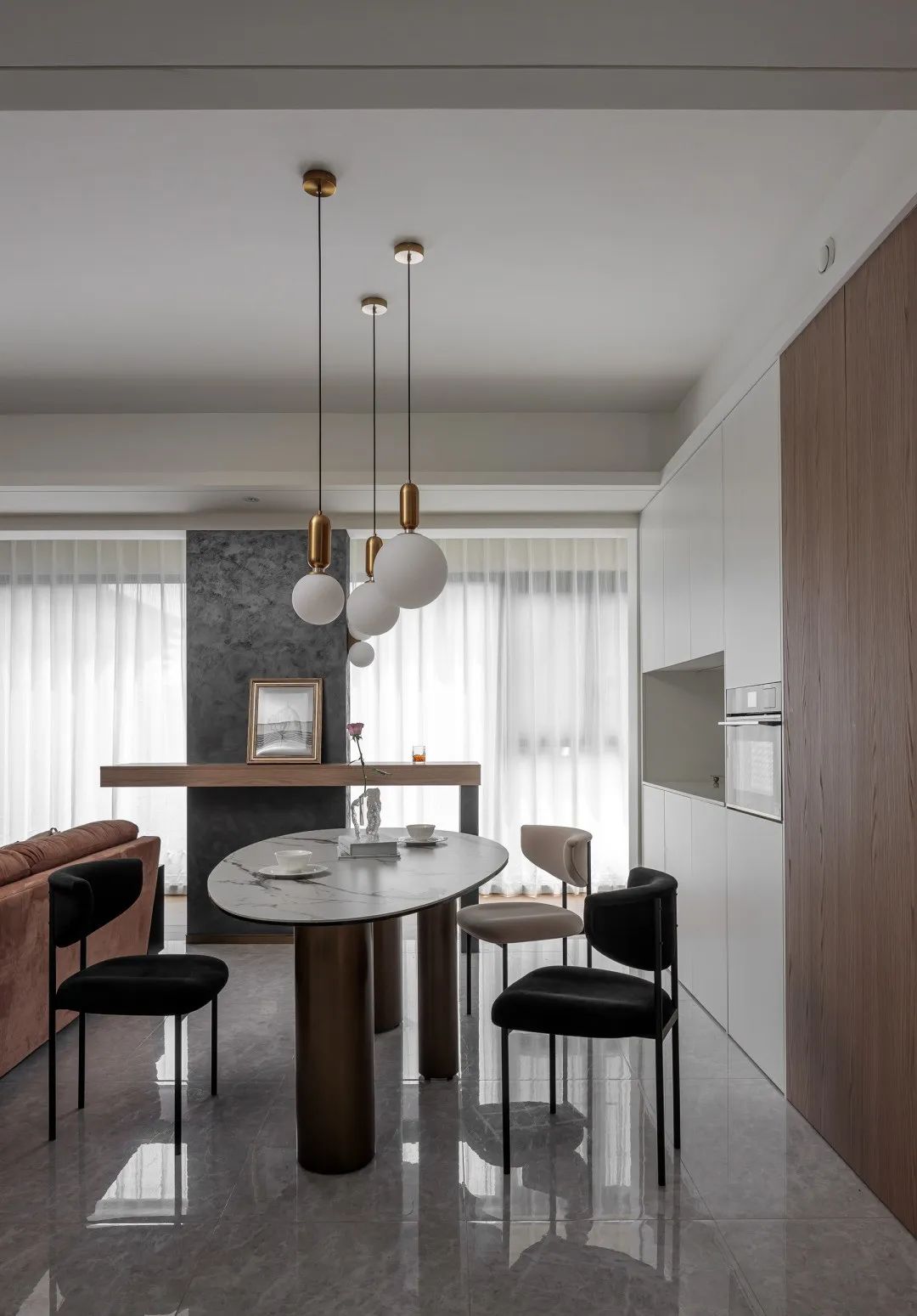 互相联通空间,便能直观感受沟通与陪伴。大理石、黄铜、绒面串联富有质感,寥寥几笔形成一幅自在、欢愉的生活画面。