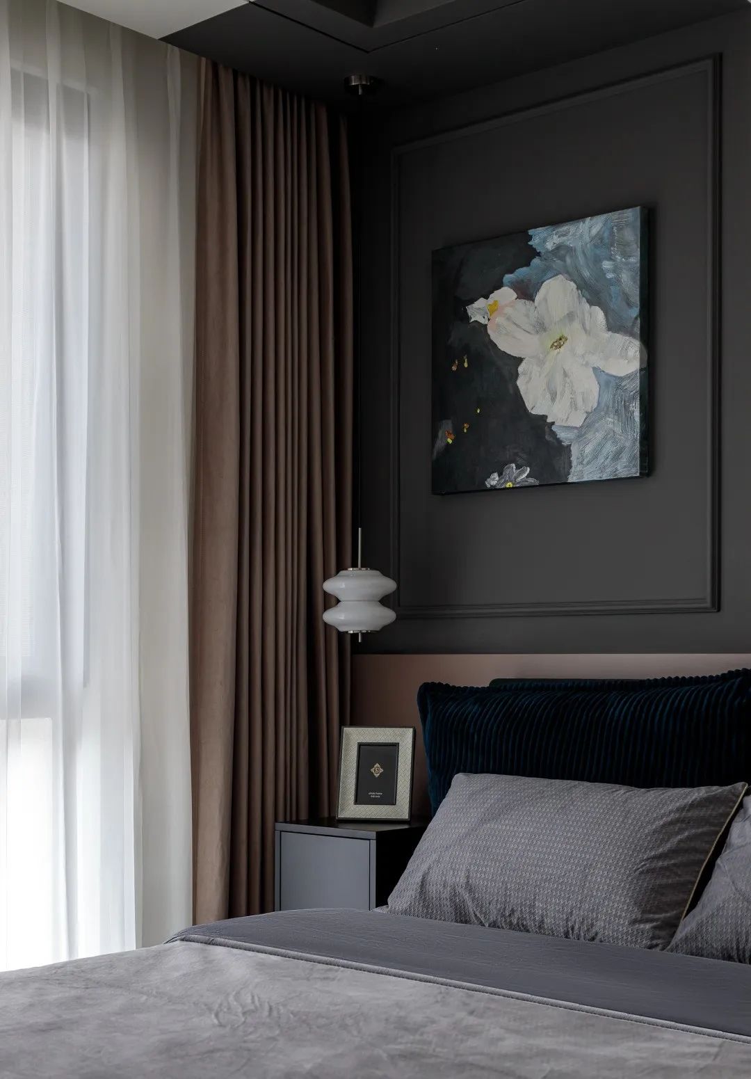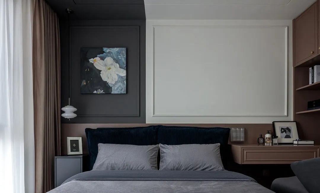 床头背景墙分色处理一路延伸到顶,模糊界限感,拓展空间深度与广度,自然而然融为一体。现代干练的灰白色,搭配厚重沉稳的鹿褐色,色块穿插悄然衍生令人沉静的气息。