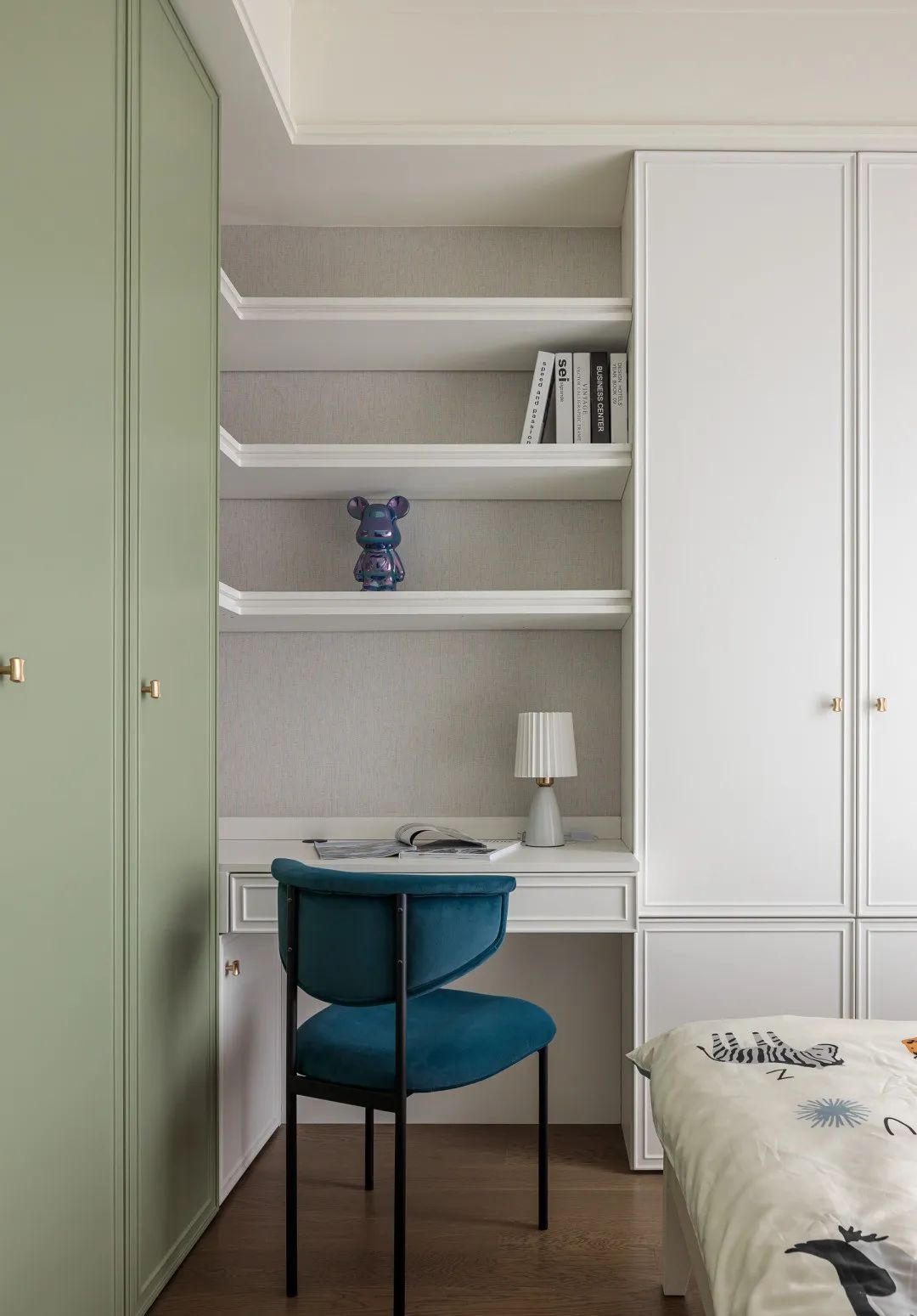 孩子虽然还小,柜体设计同时满足衣柜、书桌的生活需求,得以窥见居者对这一空间的长久规划。