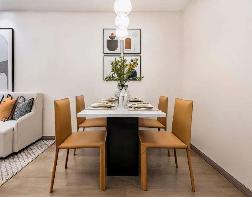 餐桌是典型的城市现代风格,背景墙放了几幅挂画烘托气氛。餐椅的颜色是延续了客厅的颜色,整体非常的协调呼应。
