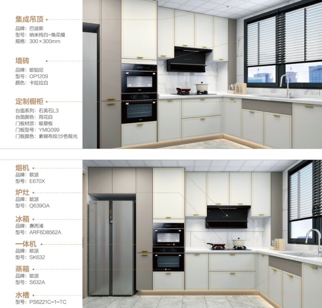 厨房:吊顶、墙砖地砖、定制橱柜、烟机炉灶、冰箱