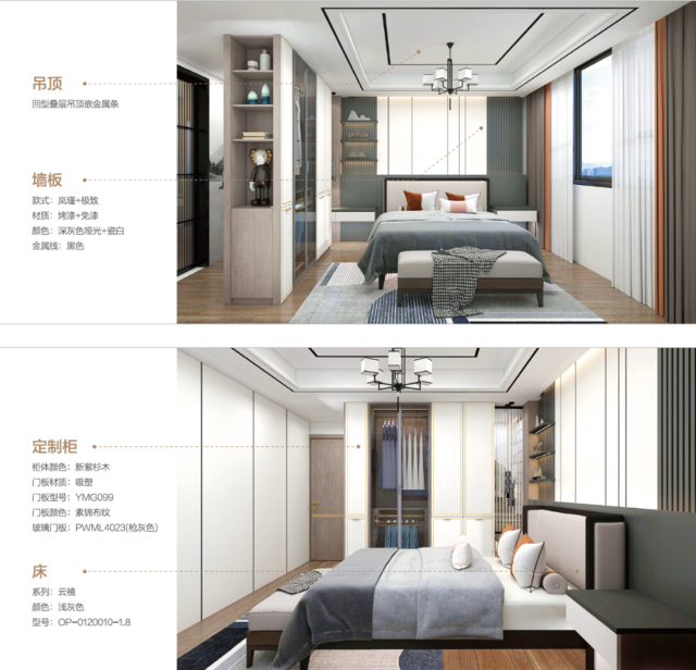 主次卧:吊顶、定制柜、地板、墙面、床、床头柜