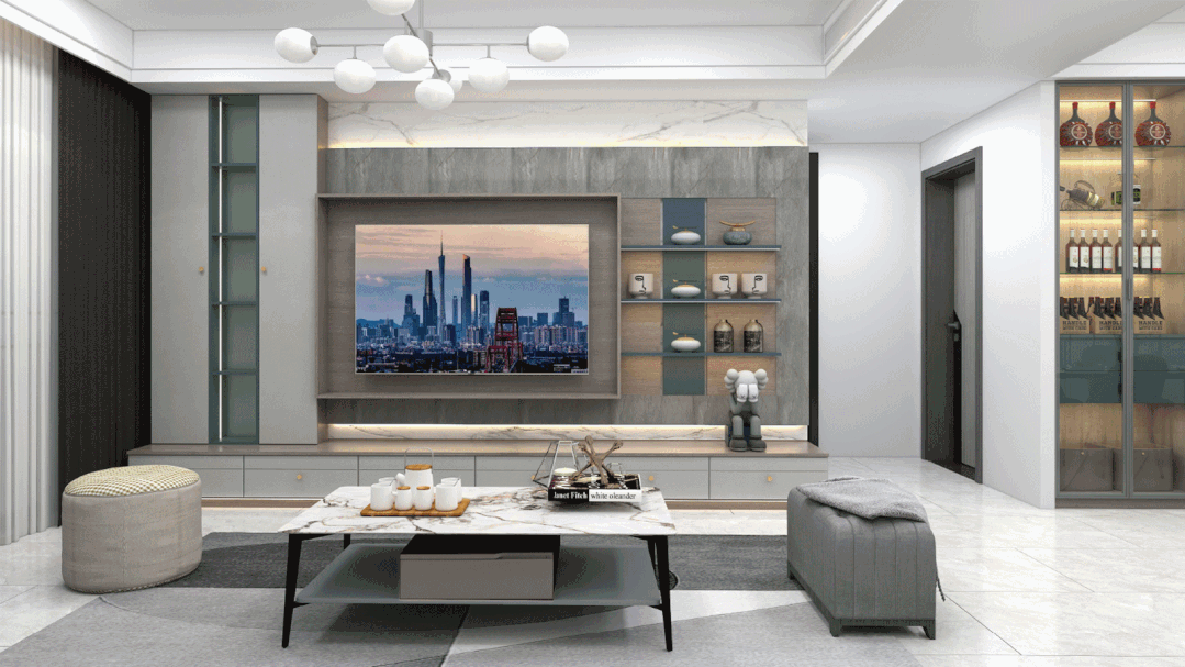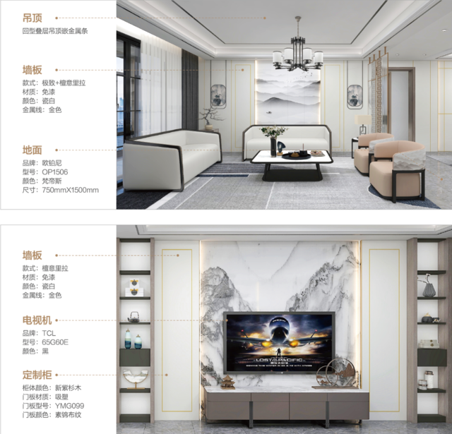 客餐厅:吊顶、墙面、地砖、沙发、电视柜、餐桌餐椅、背景墙