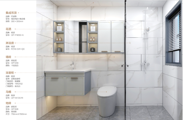 卫生间:吊顶、墙砖地砖、淋浴房马桶、浴室柜、花洒水龙头