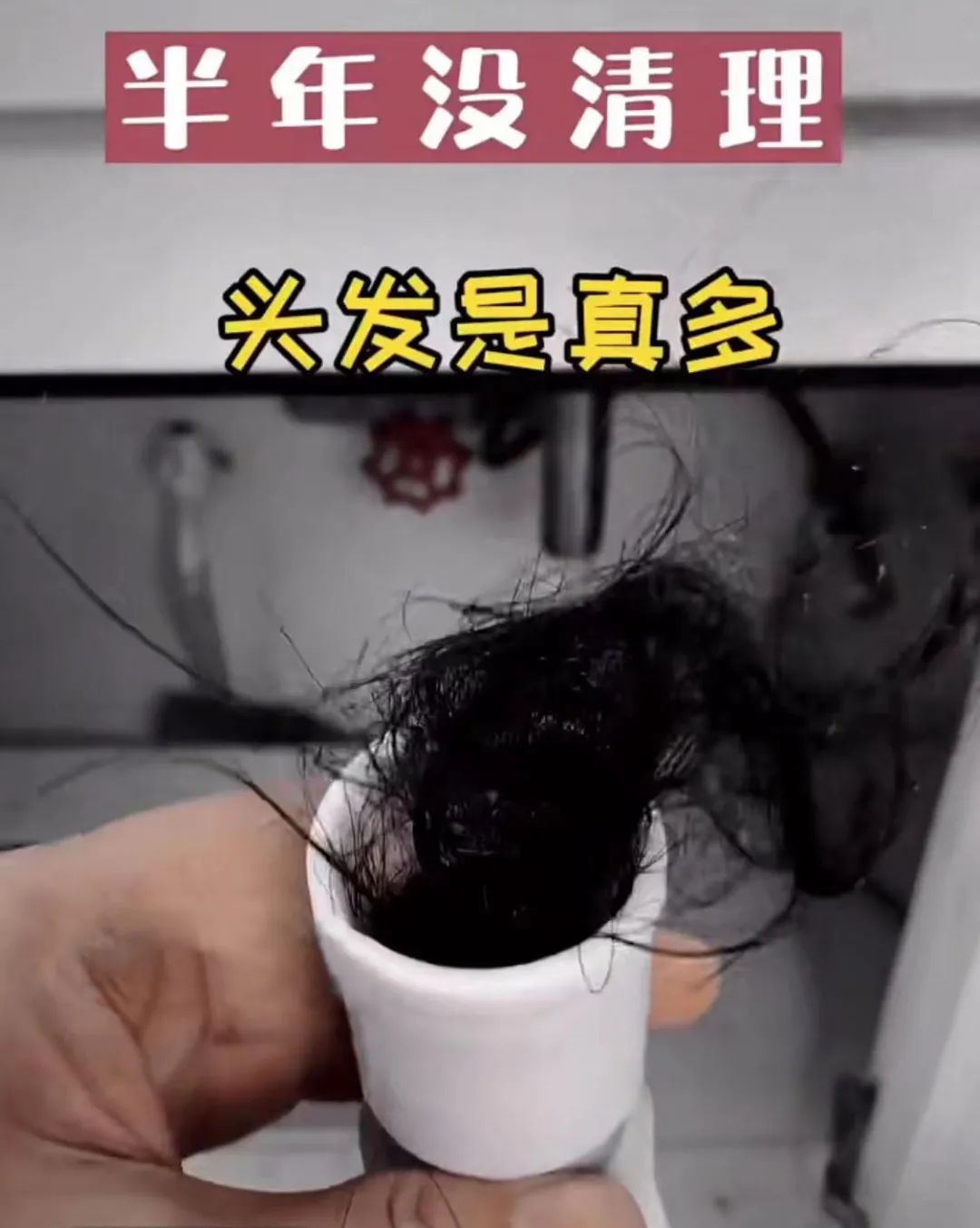 洗手盆使用时间长了,水管很容易就堵塞,我爸在梳理水管的时候发现,水管里全是头发,被吐槽一番。