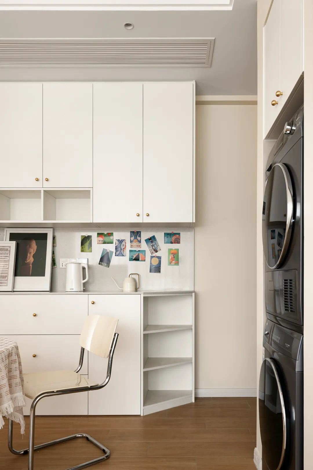 定制的纯白餐边柜能满足这个房屋的绝大部分收纳需求。