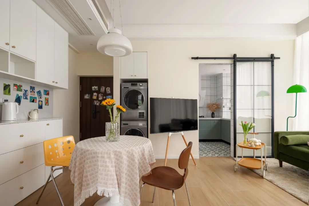这是一套面积仅有44平米小户型,屋主是一对幸福甜蜜的小两口,色彩上,他们希望这个家能通过和谐的色彩搭配,呈现温馨有活力的氛围。