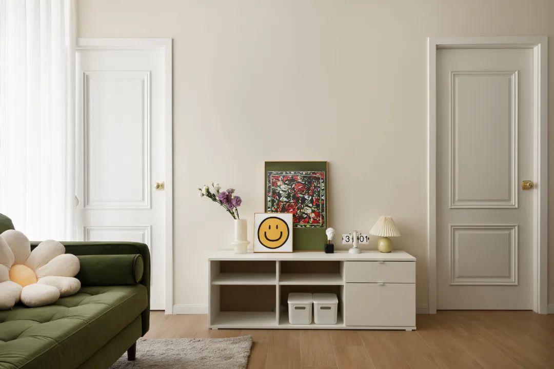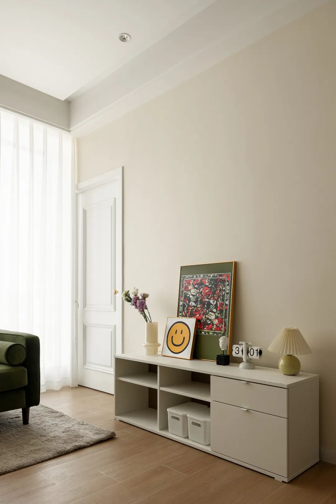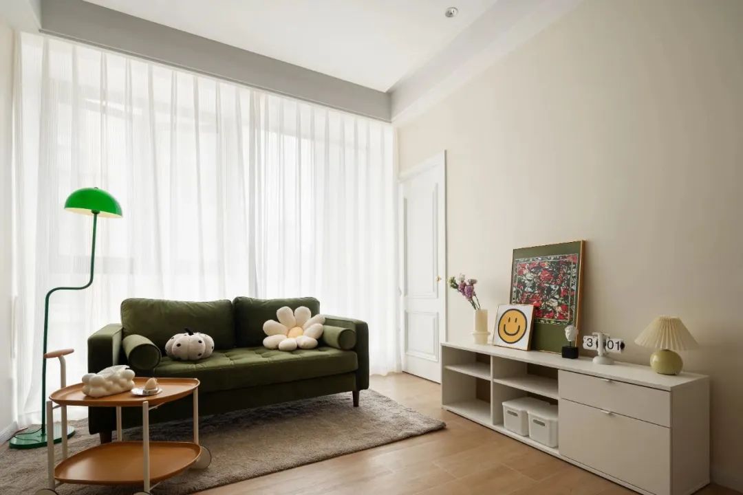 奶油色的背景墙,复古的绿色沙发与装饰画相呼应,整体给人非常清爽温馨的感觉。