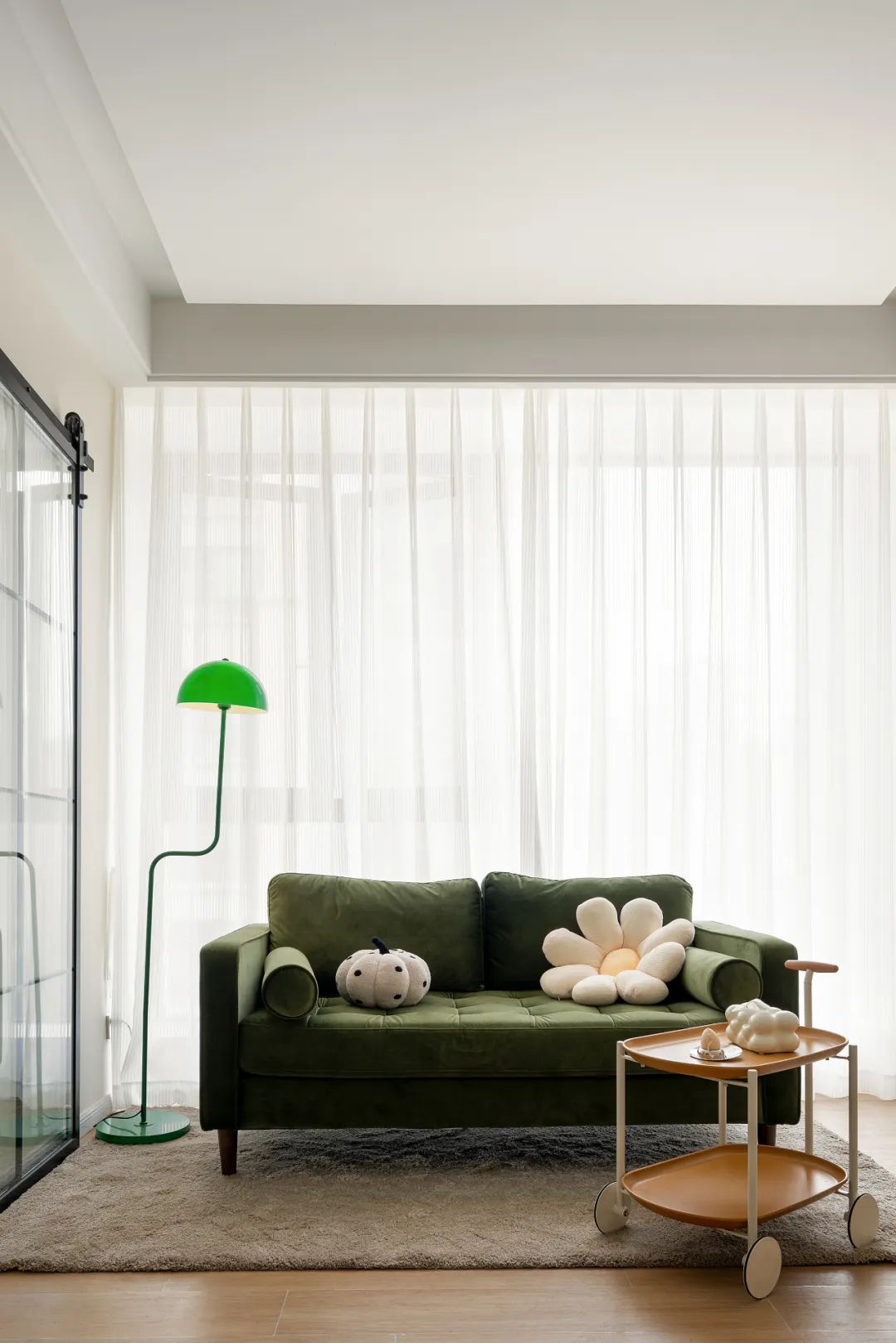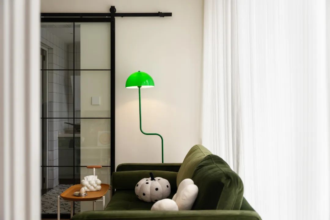 落地小绿灯与绿沙发相互呼应,一点不同色的点缀让这个原木色系的家更有活力。