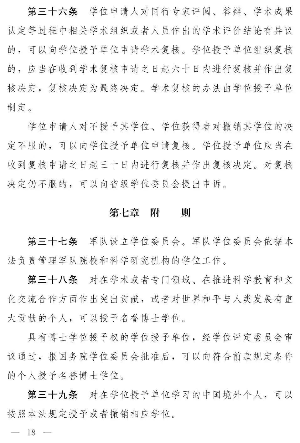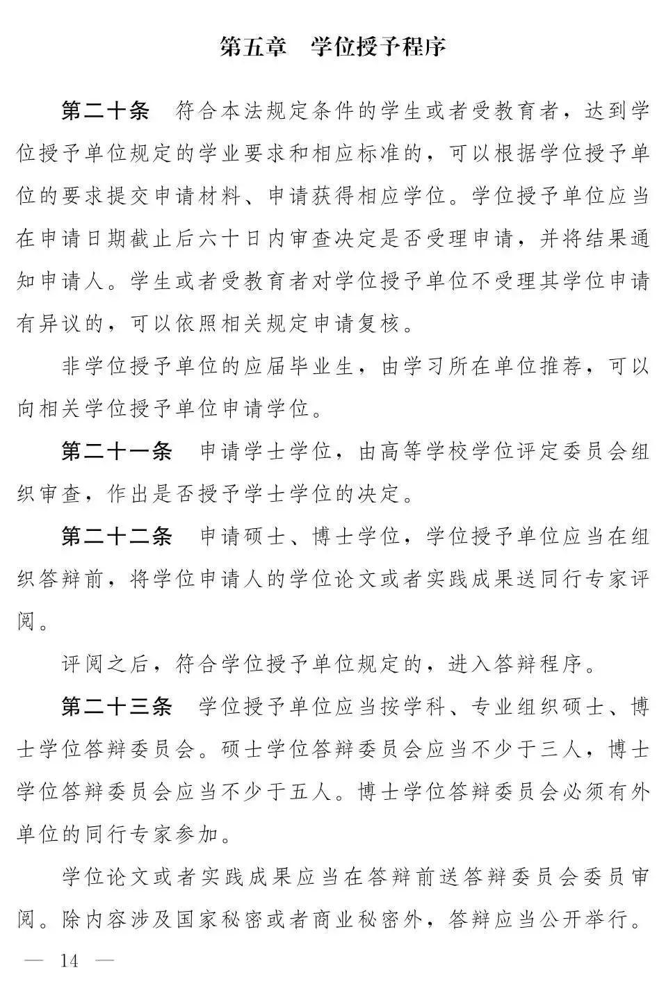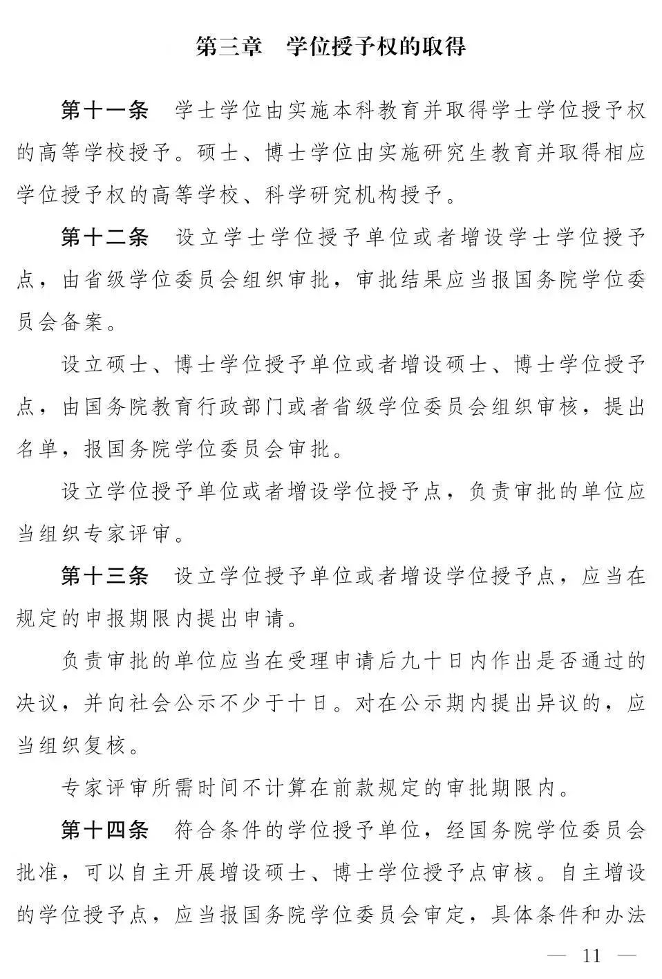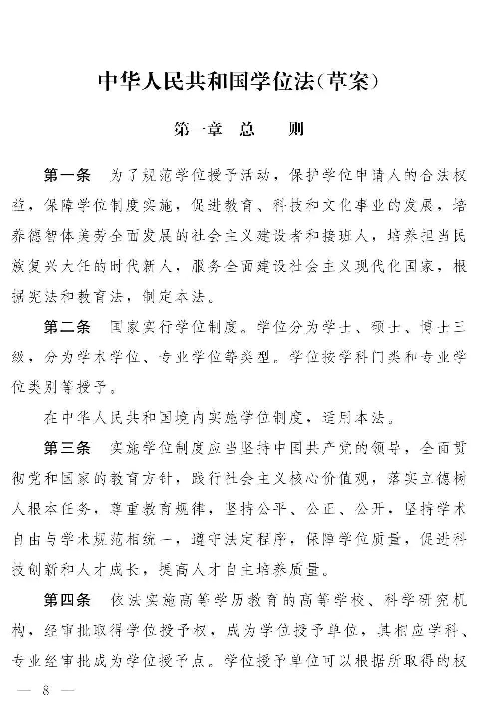 草案共7章40条,包括总则、学位管理体制、学位授予权的取得、学位授予条件、学位授予程序、学位质量保障与监督、附则。