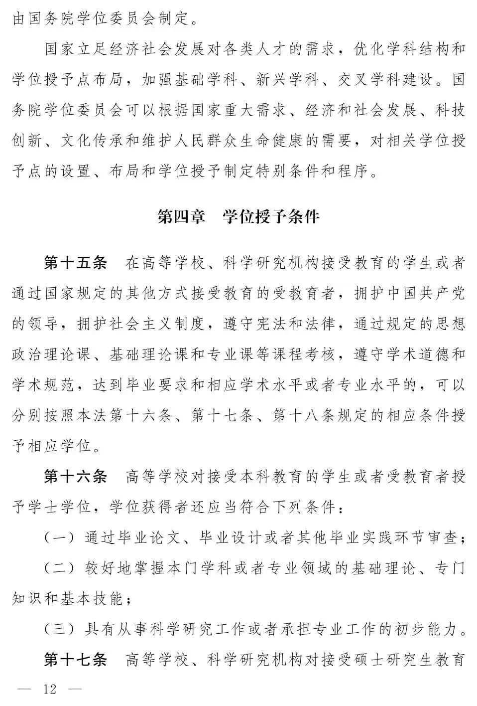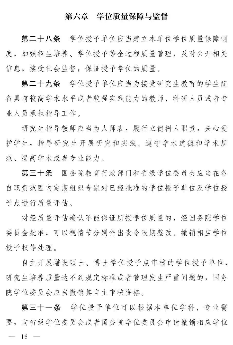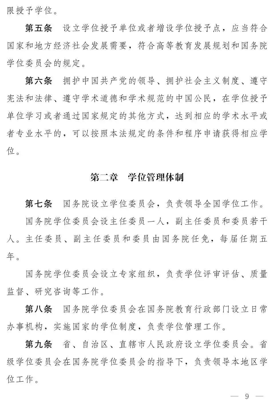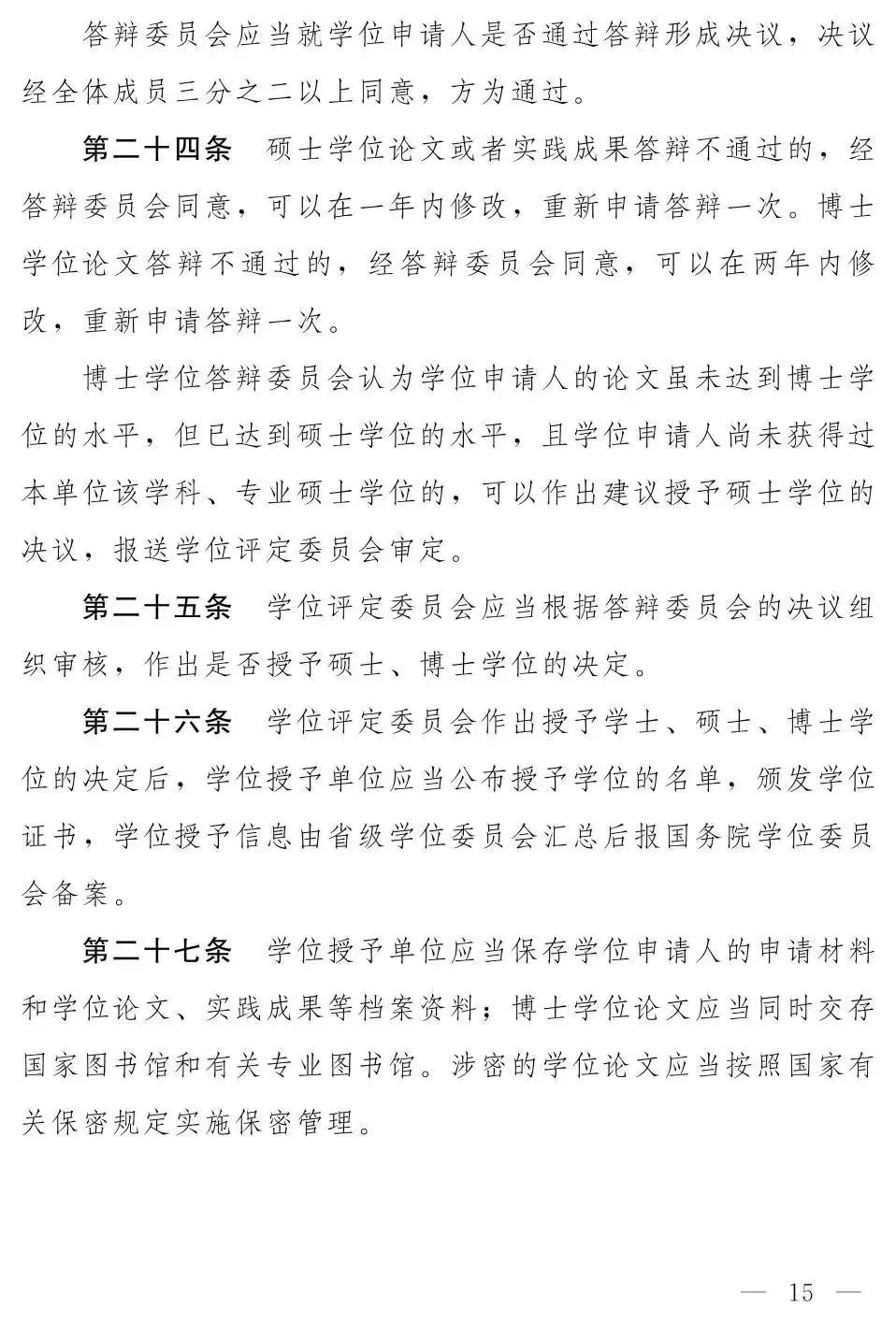 草案共7章40条,包括总则、学位管理体制、学位授予权的取得、学位授予条件、学位授予程序、学位质量保障与监督、附则。