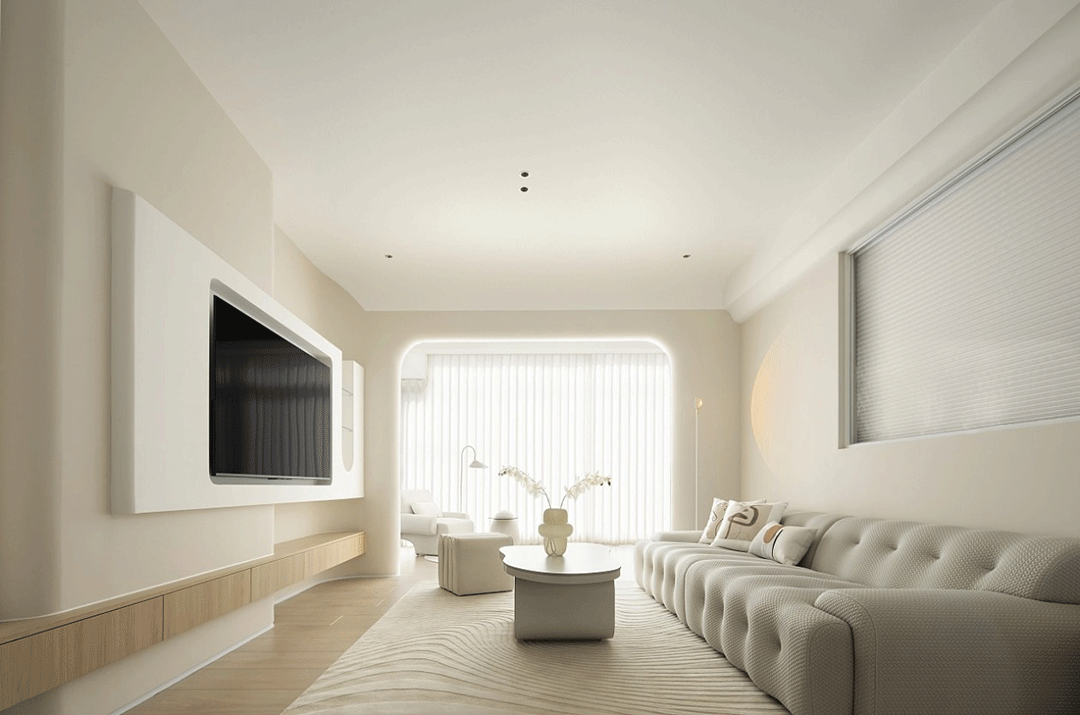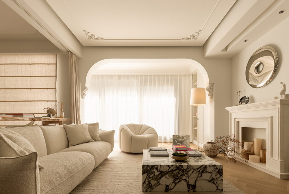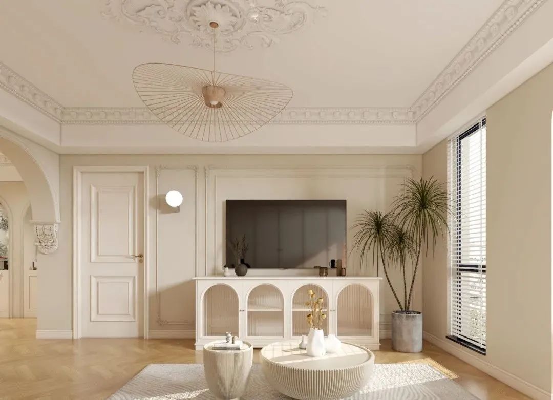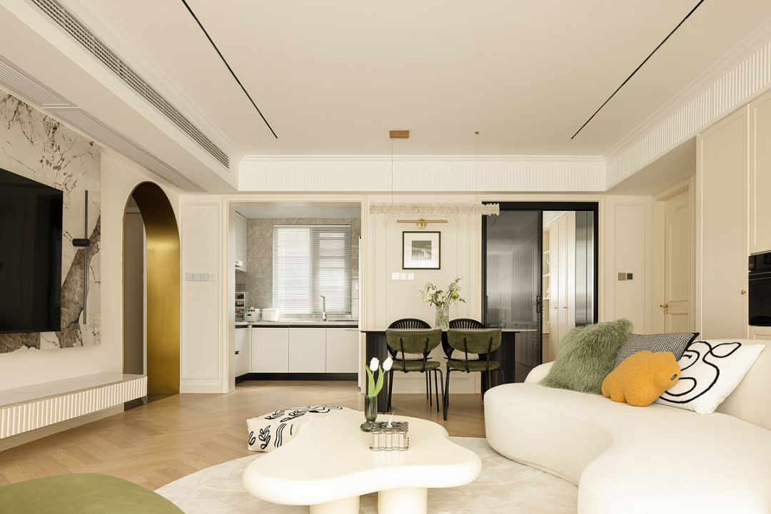 圆弧的元素可以尽可能弱化空间的棱角,增加奶油风柔和、治愈的视觉效果。表现在具体的造型上,就是拱形门、圆弧形吊顶,或者是一些弧形墙面造型。