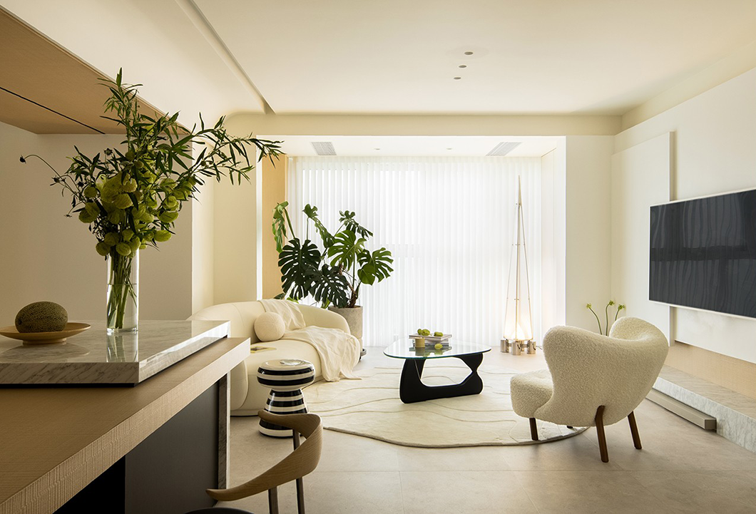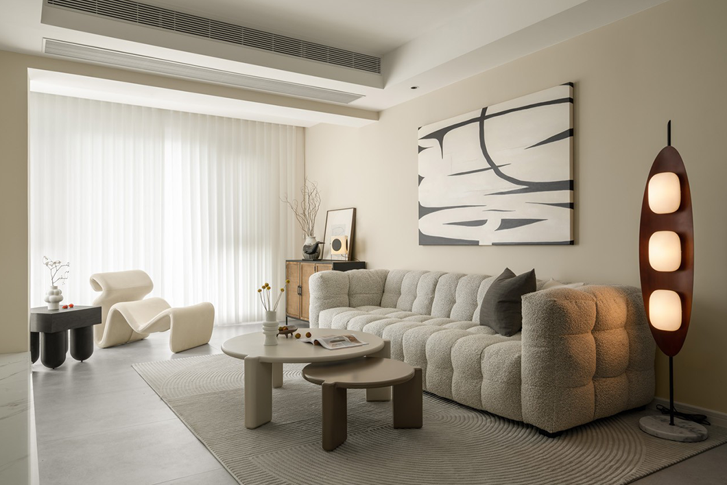 另外就是软装搭配上使用圆润的家具,这种造型的家具能让空间效果更柔和,特别是沙发、餐桌、餐椅,配合背景色搭配,增强空间氛围和调性。