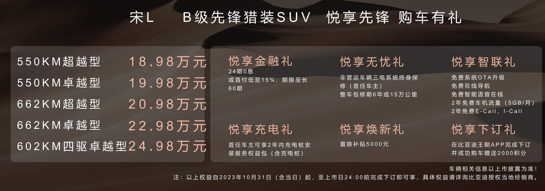 比亚迪王朝网领导,从多个角度出发,阐释了宋L的先锋性,也解析了宋L的亮点,让现场的嘉宾更加深入了解了宋L的魅力。随后,区域领导发布了新车发售价格和多重订购权益——官方指导价18.98万元——24.98万元。此外,还有包括悦享金融礼、悦享焕新礼等在内的六大上市权益,实力宠粉!