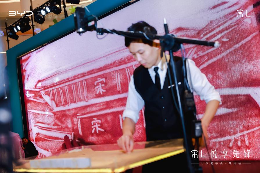 随后,沙画师现场沙画绘制,展现宋L车型亮点,一沙一世界,绘制出宋L的先锋之美,满配颜值,为新车揭幕。