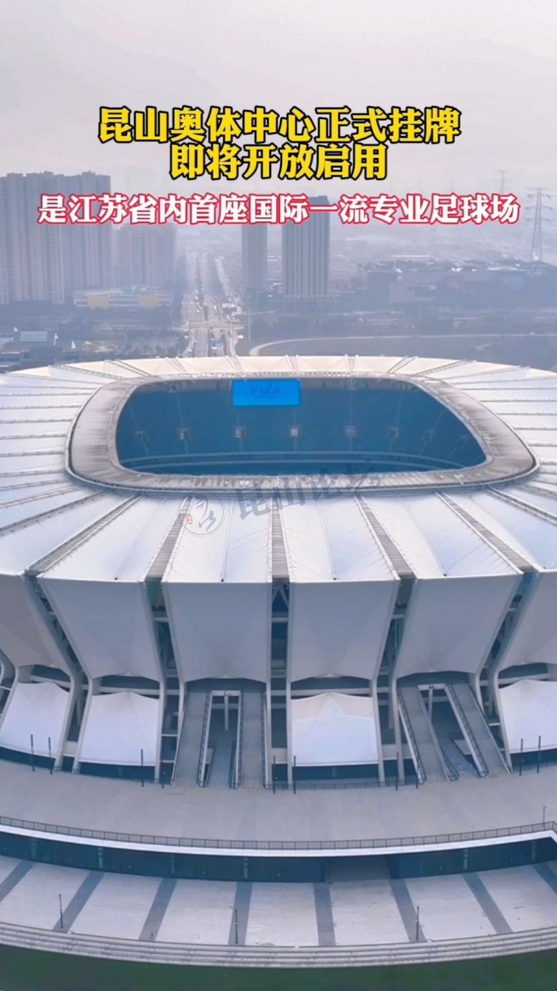 昆山奥体中心正式挂牌,标志着即将开放启用,奥体中心位于昆山市景王路以北、东城大道以东,总投资24亿,占地902亩,总建筑面积17万平方米,由足球场及其外环裙房、地下车库两部分组成,足球场主赛场可容纳4.5万人,超1000个停车位,是江苏省内首座满足国际足联要求的世界一流专业足球场。由阿里体育运营,未来将有高水平赛事在昆山奥体中心举办。