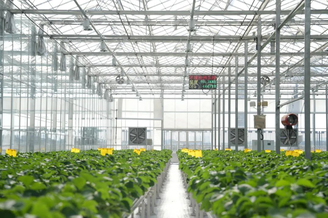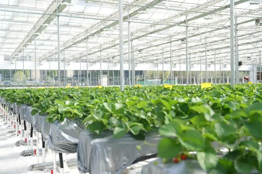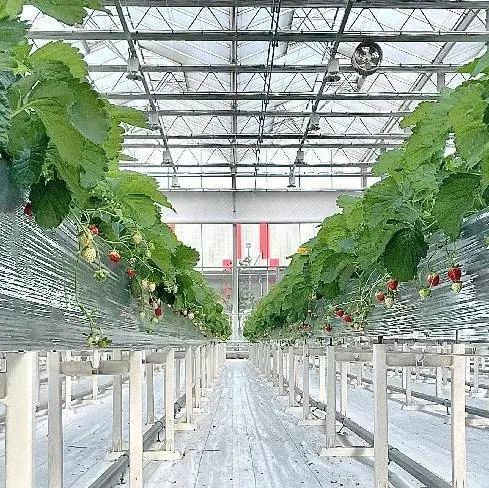 昆山市优来谷成科创中心(玉叶智慧农业产业园)建有数字化育苗工厂、数字化草莓工厂、数字化番茄工厂和自动化设备包装区等功能区域。其中,数字化草莓工厂采用Agrist H架栽培系统,建立了生长因子监测系统、压力补给滴灌系统等,可远程控制温室设施设备,在栽培、记录、展示、管理等环节实现数字化,有效提高种植效率、降低病虫害、开展草莓智慧化种植。